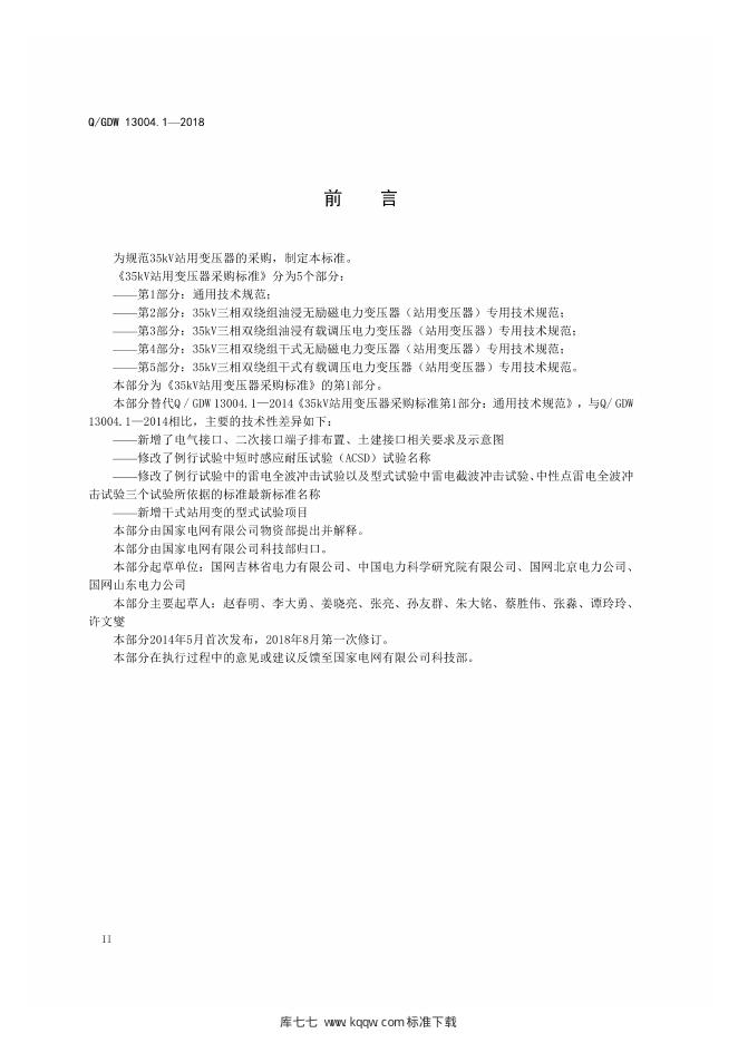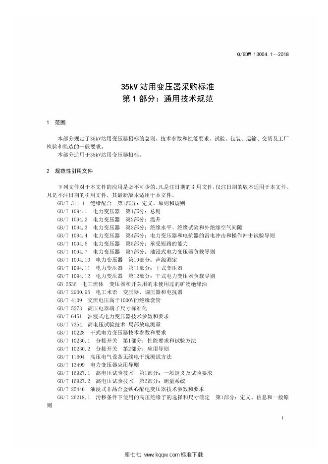 Q/GDW 13004.1-2018 35kV站用变压器采购标准 第1部分:通用技术规范