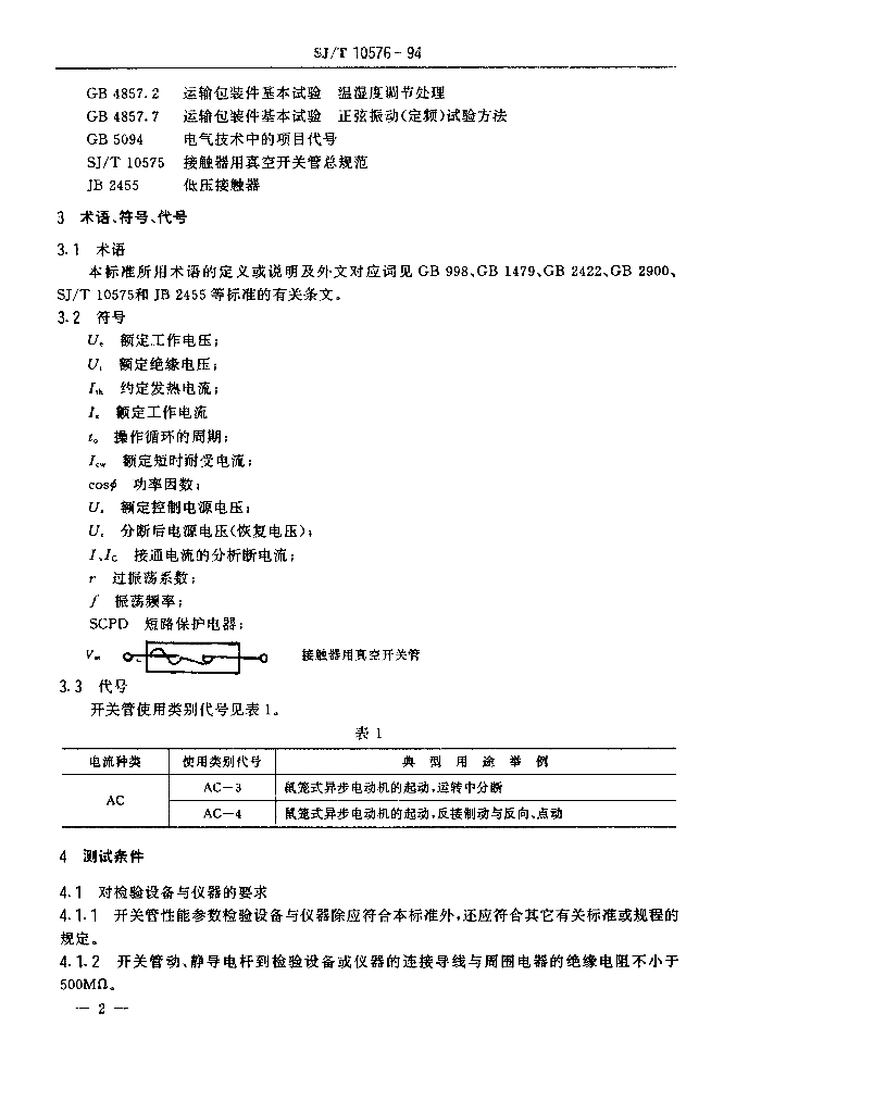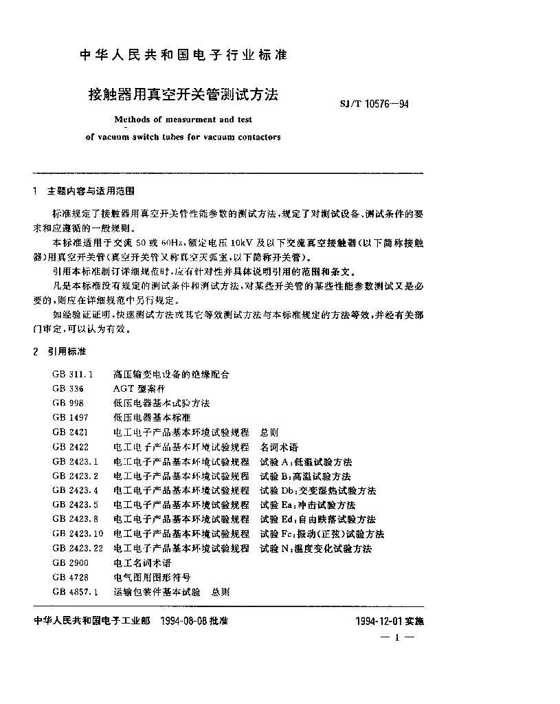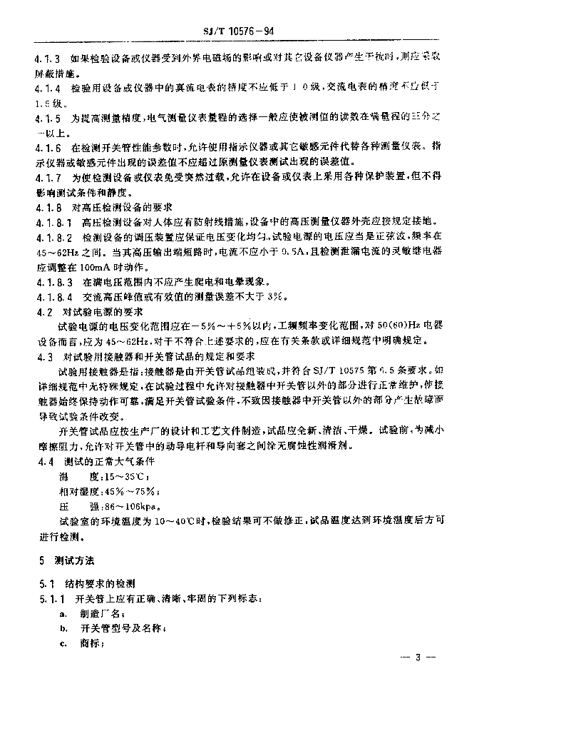 SJ/T 10576-1994 接触器用真空开关管测试方法