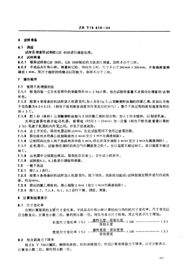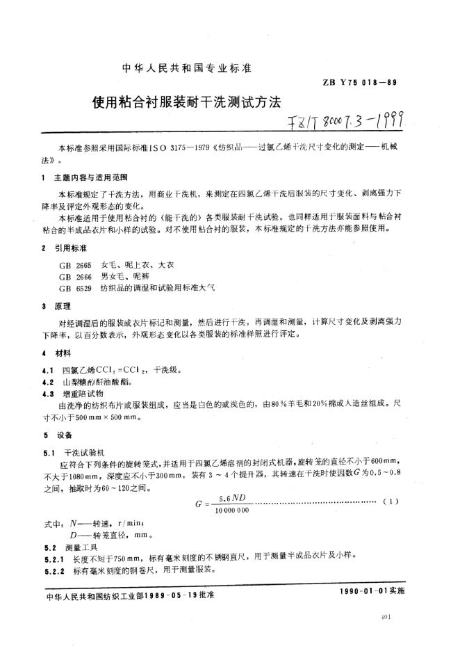 ZBY 75018-1989 使用粘合衬服装耐干洗测试方法