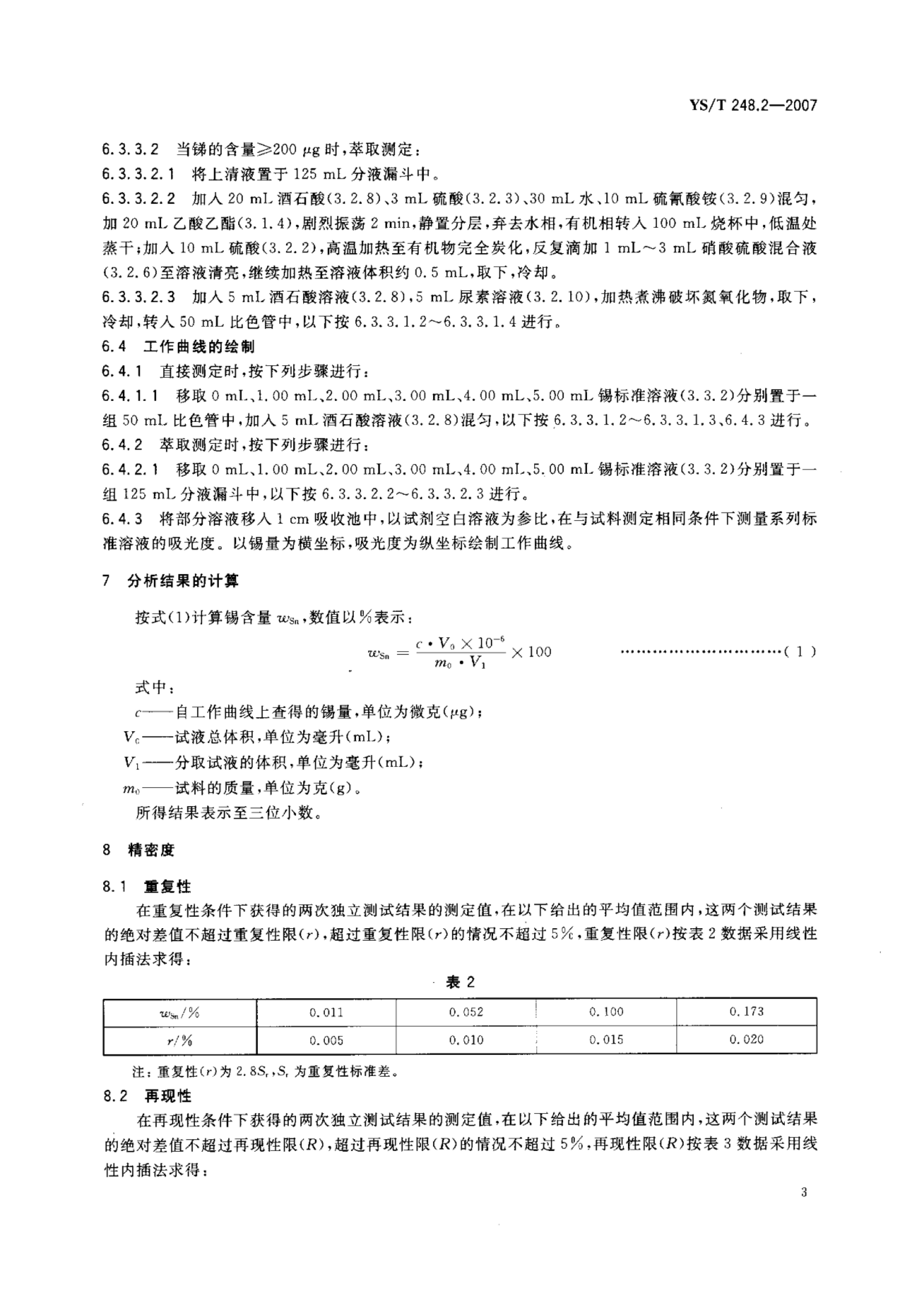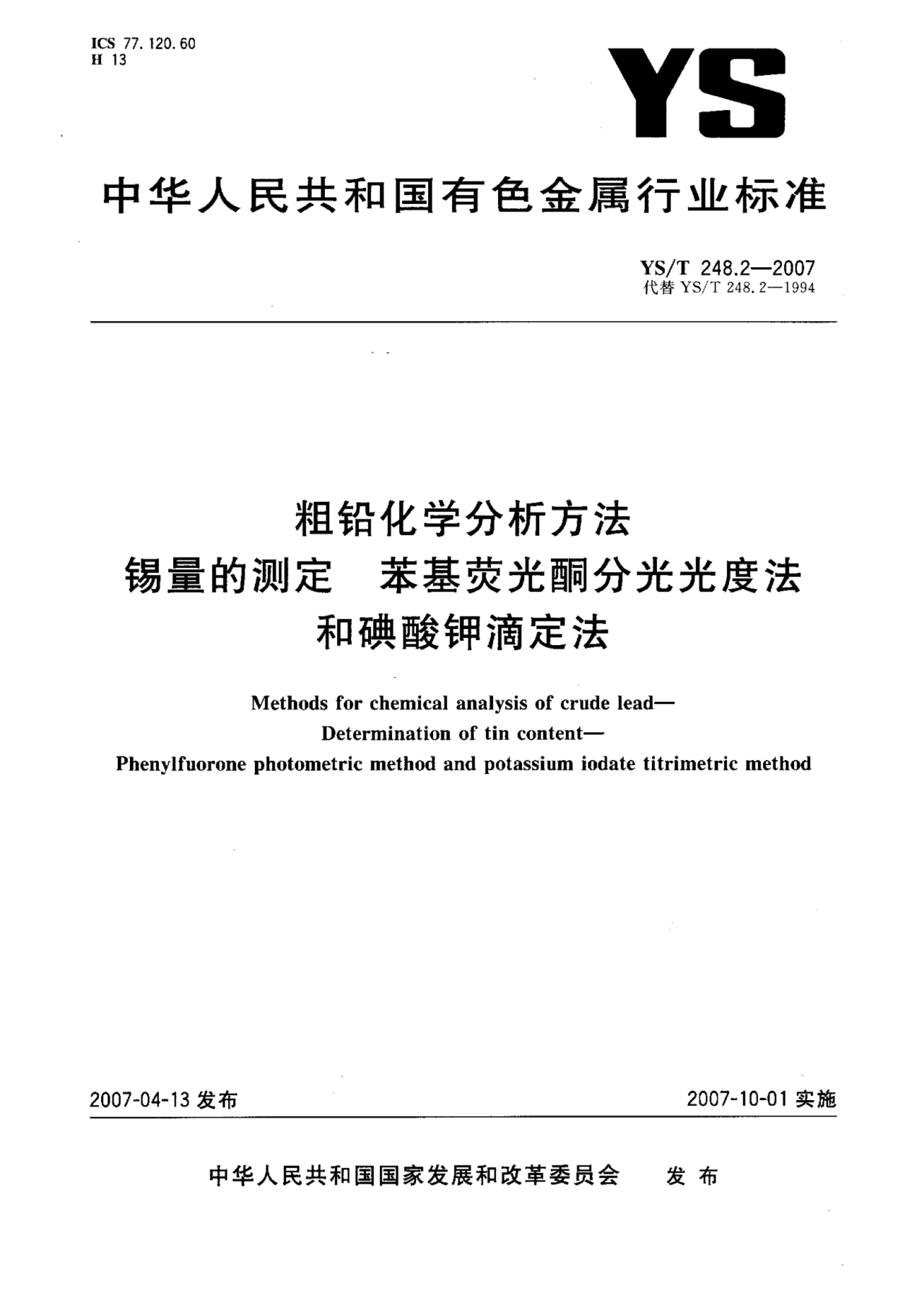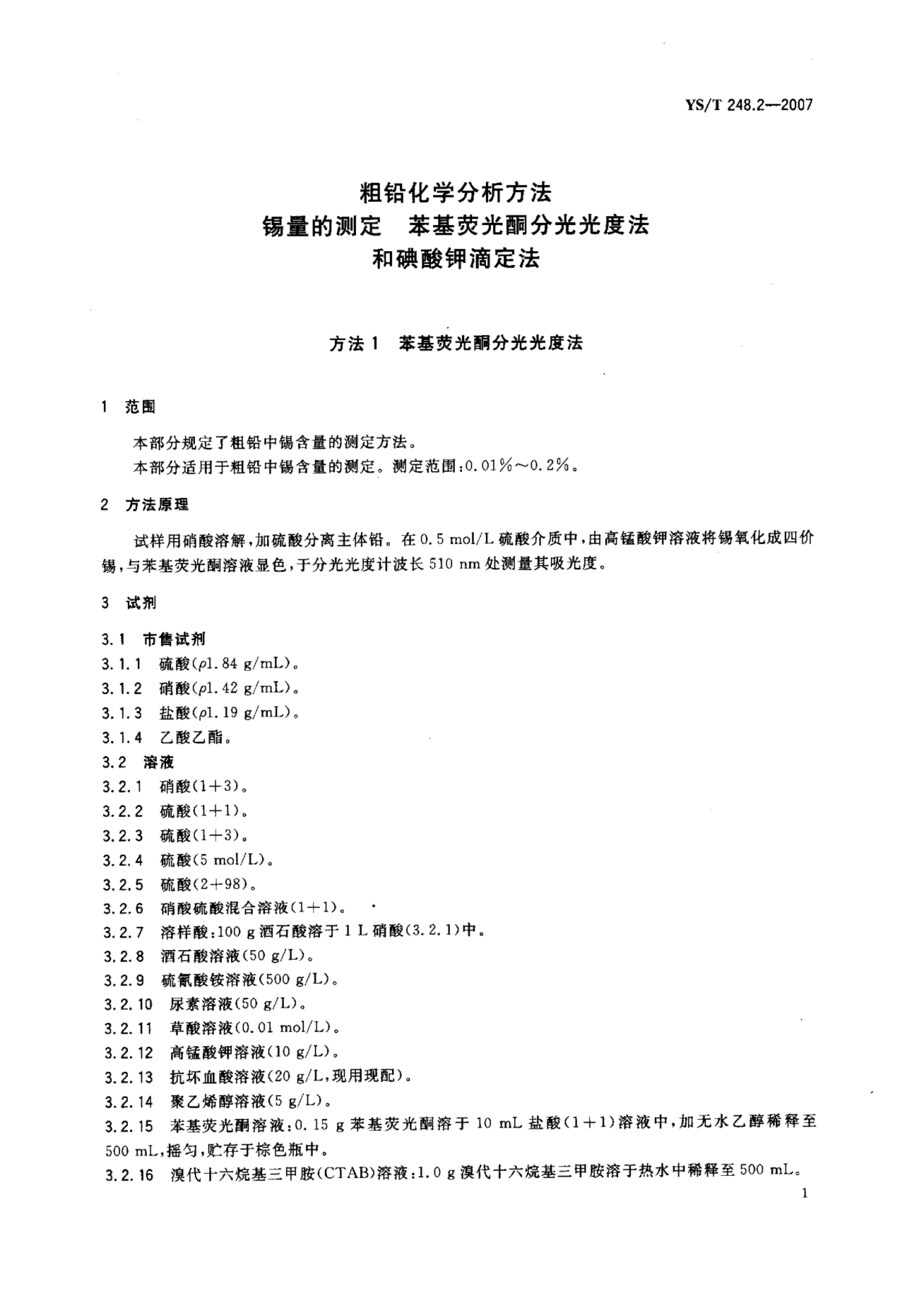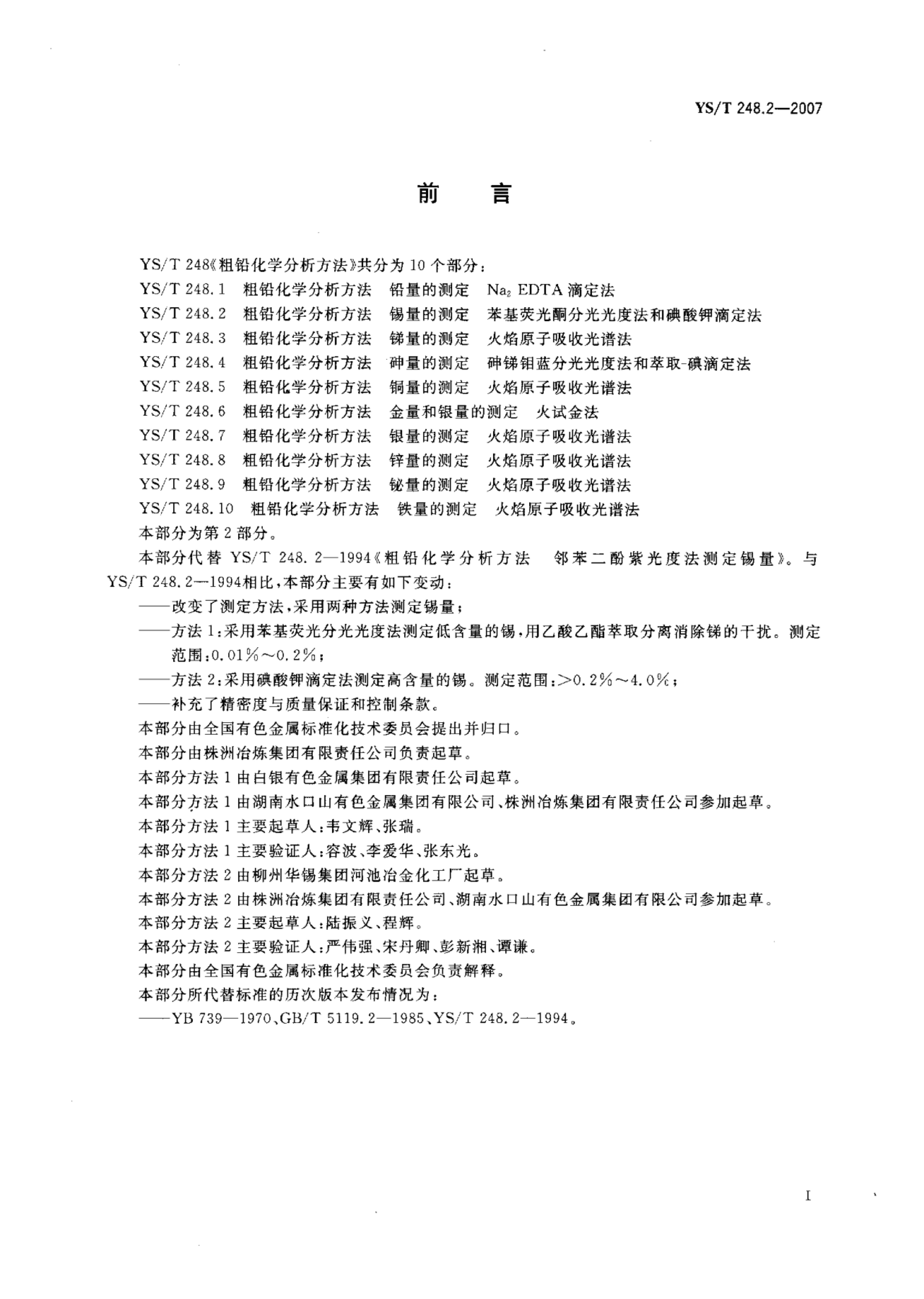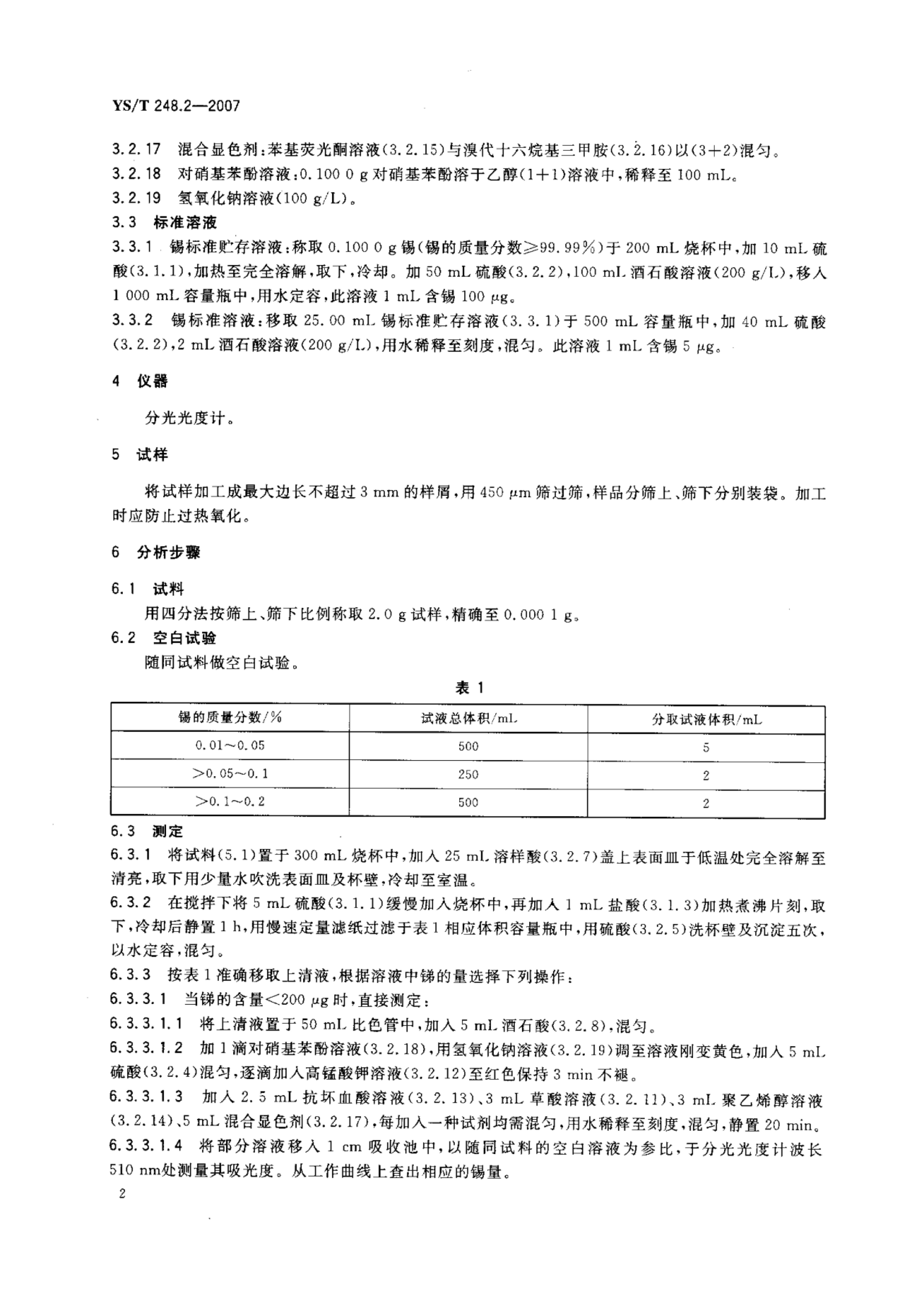 YS/T 248.2-2007 粗铅化学分析方法锡量的测定苯基荧光酮分光光度法和碘酸钾滴定法