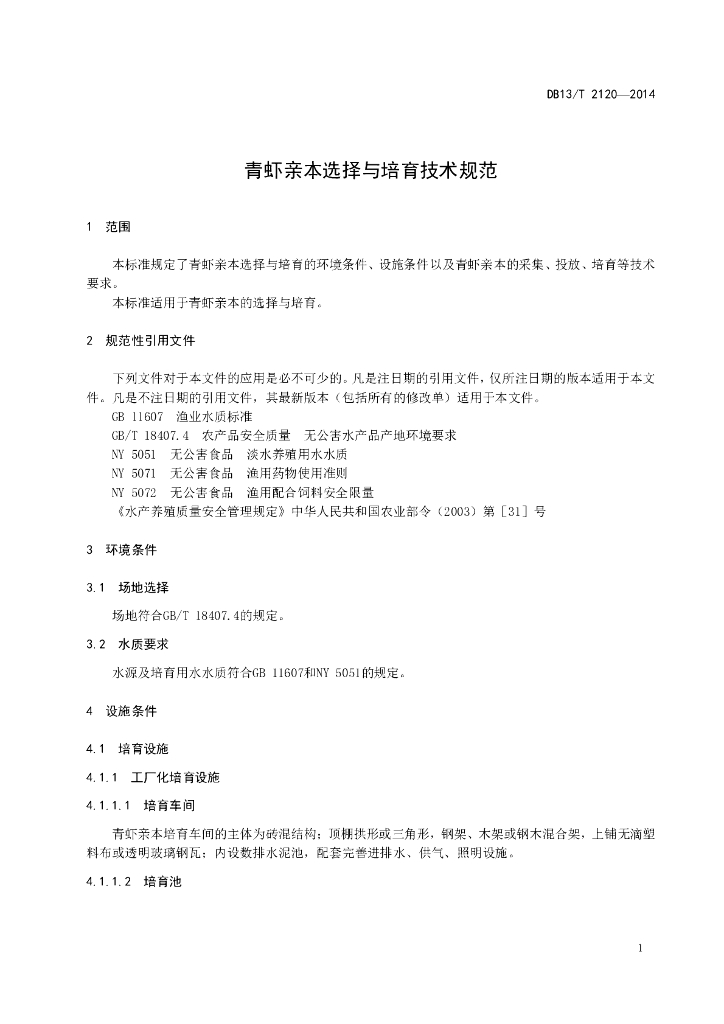 DB13/T 2120-2014 青虾亲本选择与培育技术规范