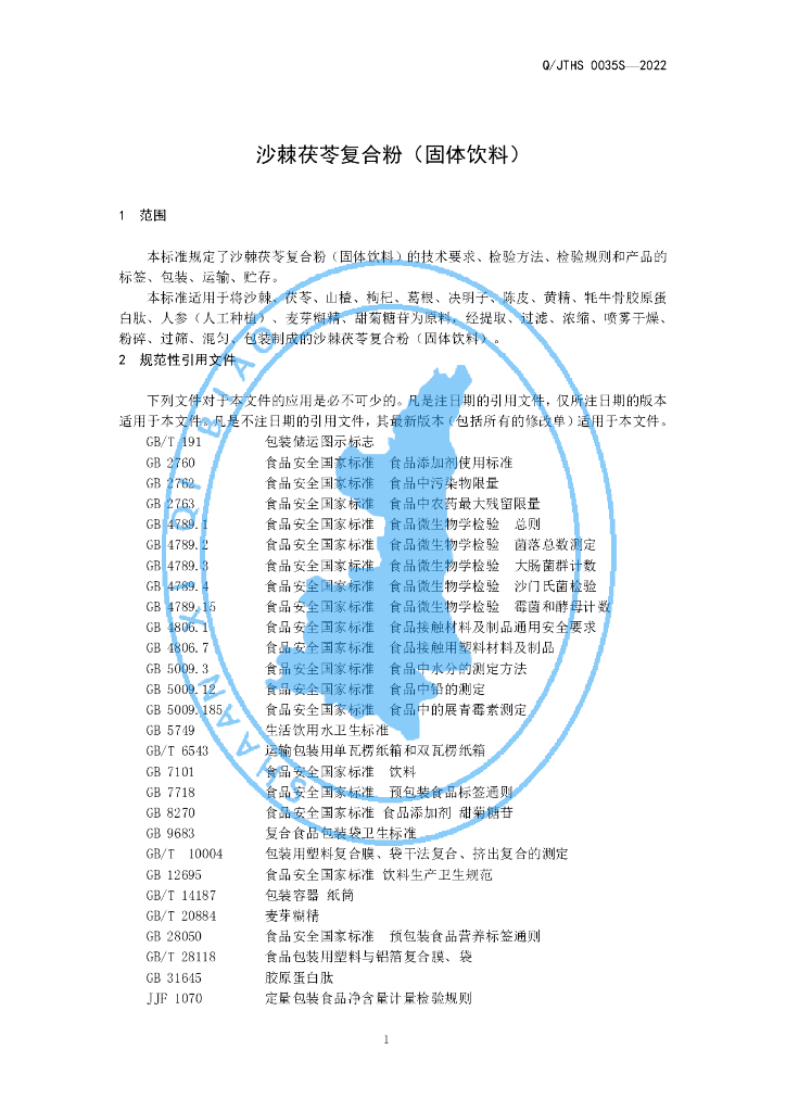 Q/JTHS 0035S-2022 沙棘茯苓复合粉(固体饮料)