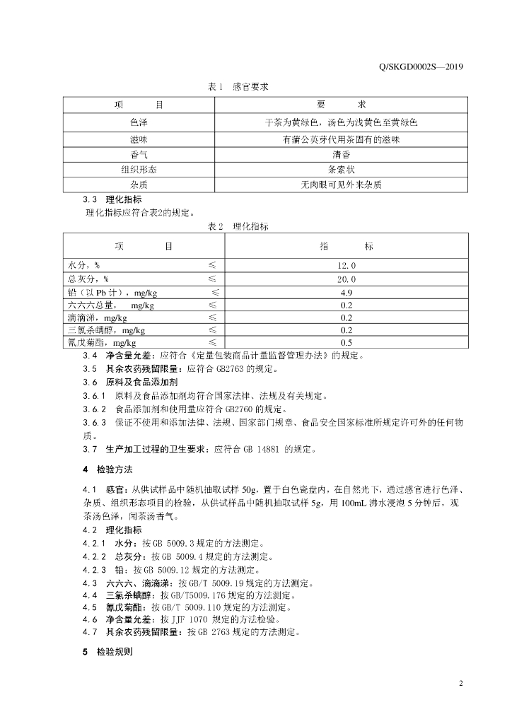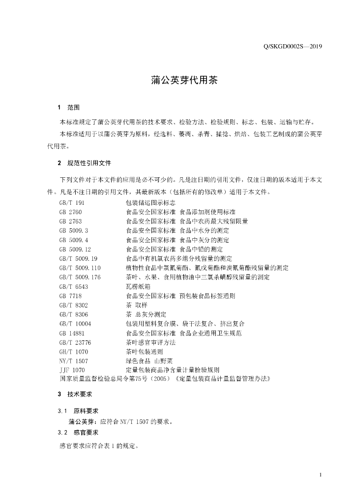 Q/SKGD 0002S-2019 蒲公英芽代用茶