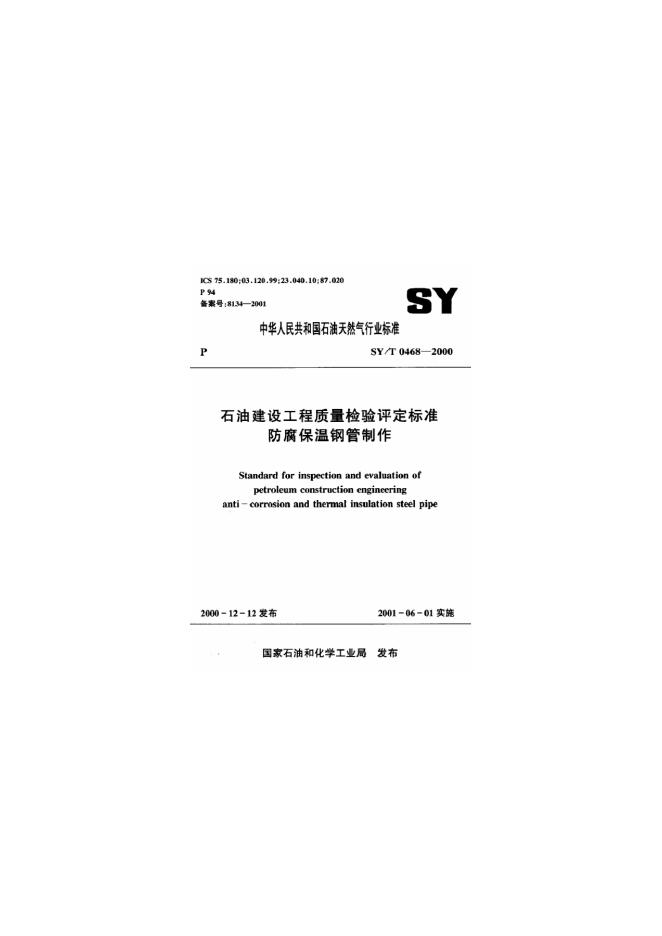 SY/T 4068-1993 石油建设工程质量检验评定标准防腐保温钢管制作
