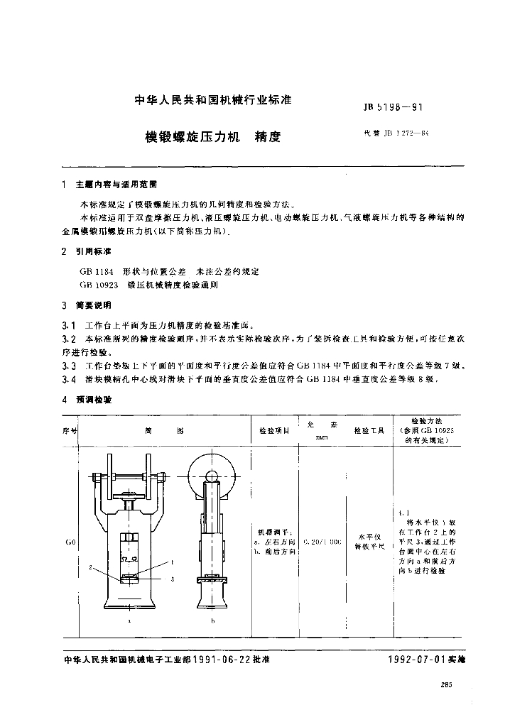 JB 5198-1991 模锻螺旋压力机精度