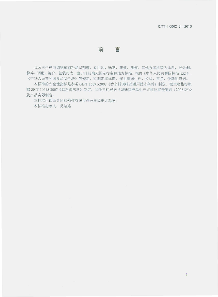 Q/YTH 0002S-2010 调味辣椒粉