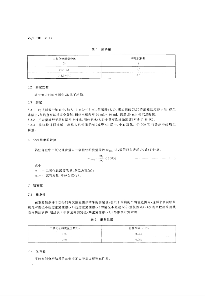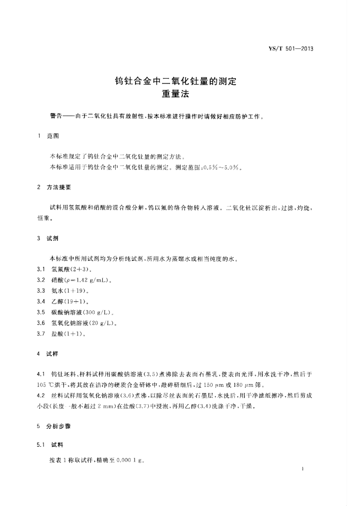 YS/T 501-2013 钨钍合金中二氧化钍量的测定重量法