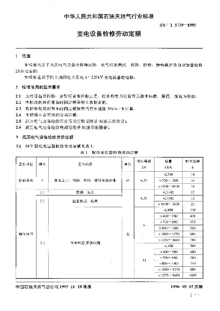 SY/T 5739-1995 变电设备检修劳动定额