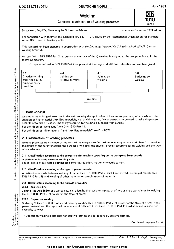 DIN 1910-1-1983 焊接 第1部分 焊接概念焊接方法分类