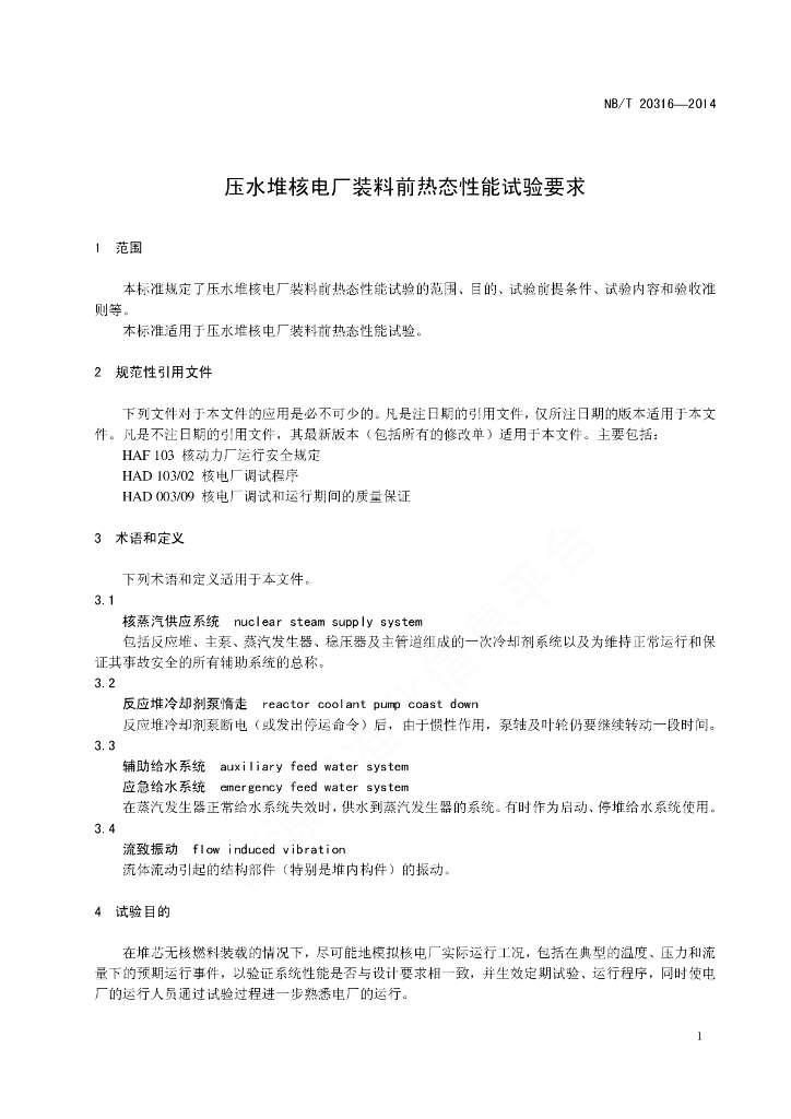 NB/T 20316-2014 压水堆核电厂装料前热态性能试验要求