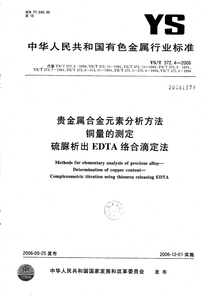 YS/T 372.4-2006 贵金属合金元素分析方法 铜量的测定硫脲析出EDTA络合滴定法
