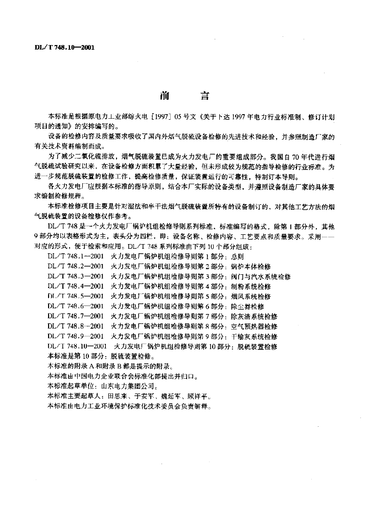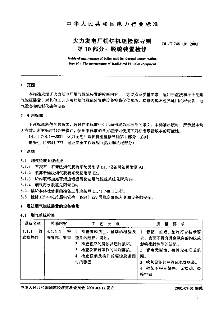 DL/T 748.10-2001 火力发电厂锅炉机组检修导则 第10部分:脱硫装置检修