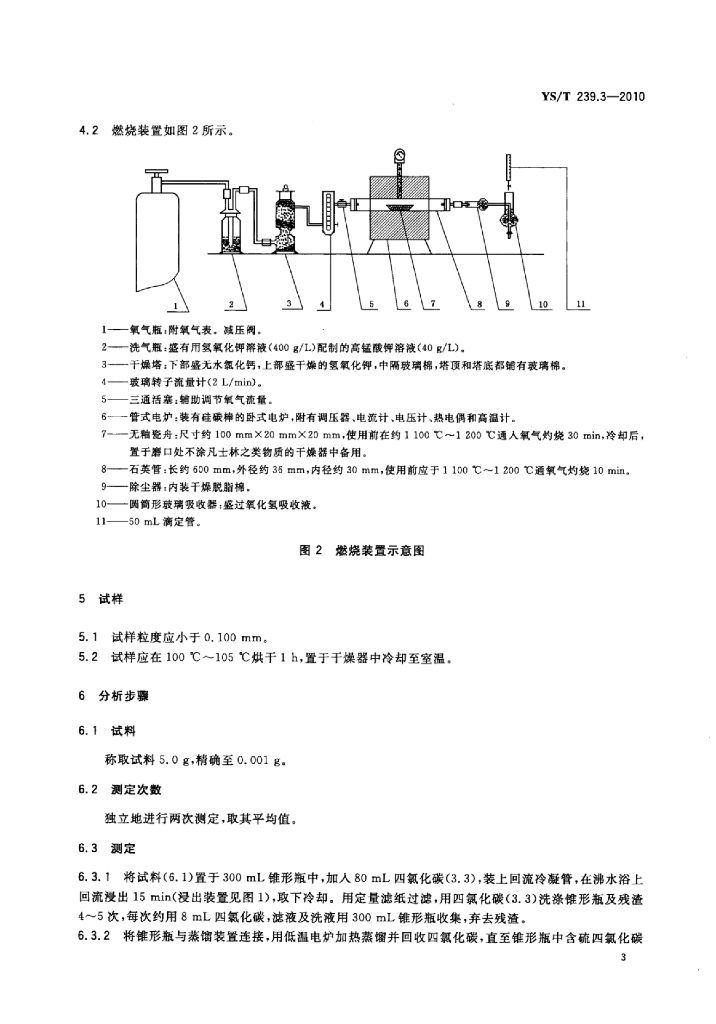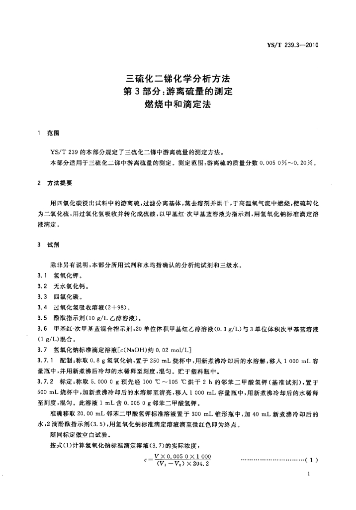 YS/T 239.3-2010 三硫化二锑化学分析方法 第3部分:游离硫量的测定燃烧中和滴定法