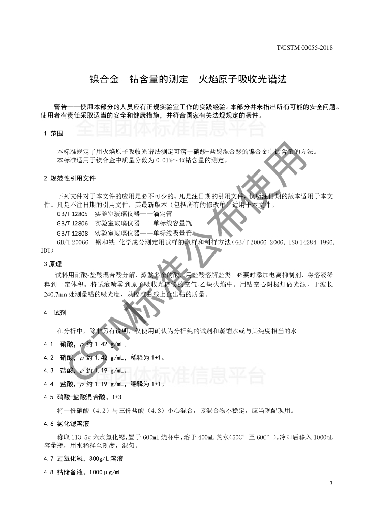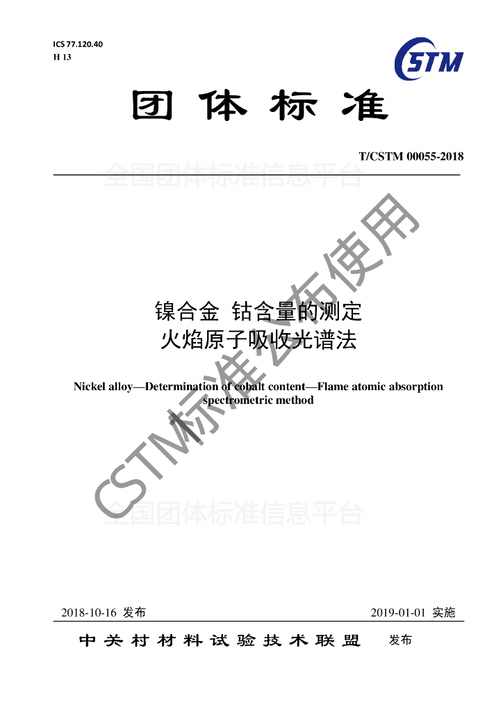 T/CSTM 00055-2018 镍合金 钴含量的测定 火焰原子吸收光谱法