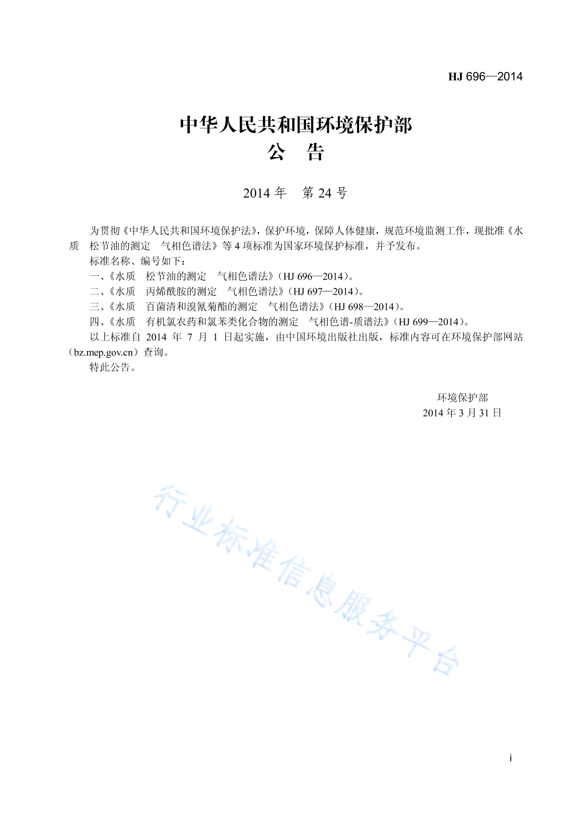 HJ 696-2014 水质 松节油的测定 气相色谱法
