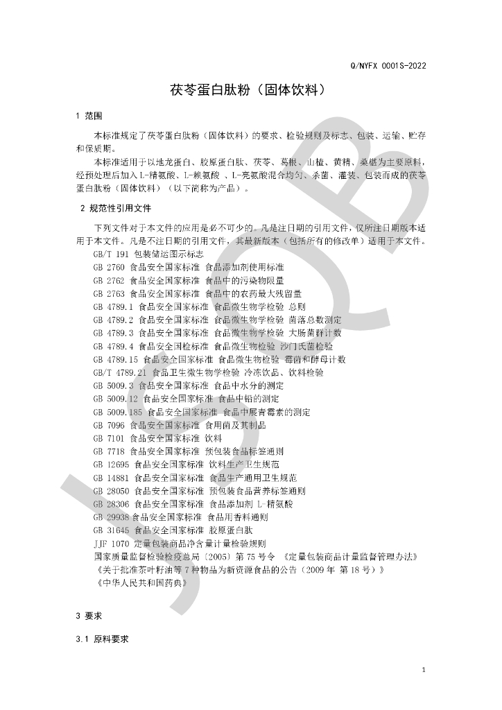 Q/NYFX 0001S-2022 茯苓蛋白肽粉(固体饮料)