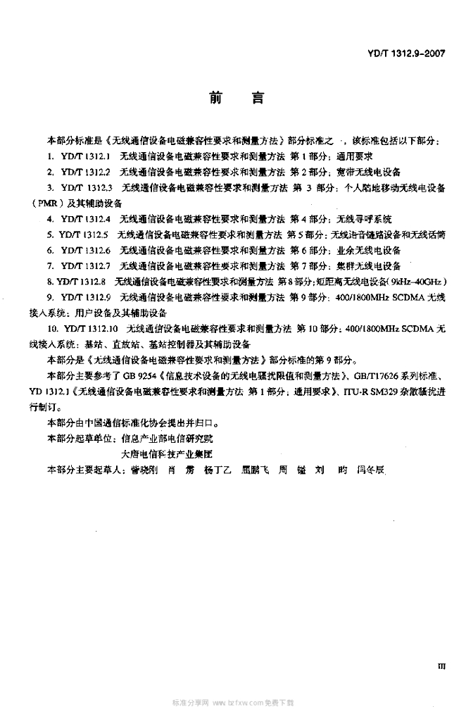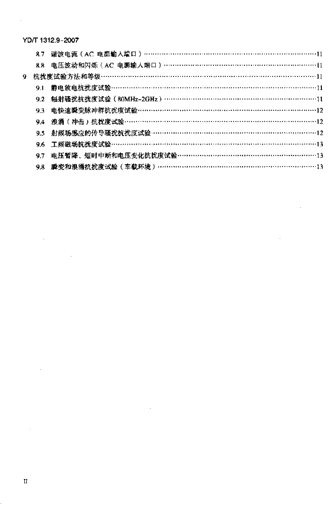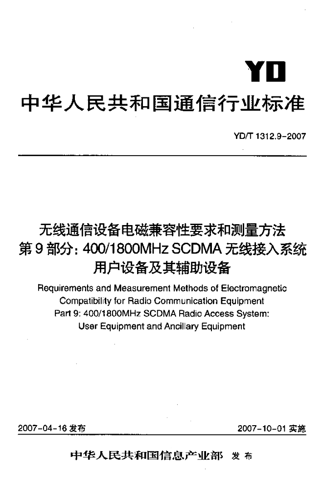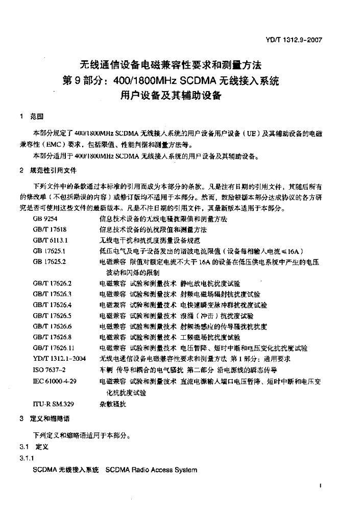 YD/T 1312.9-2007 无线通信设备电磁兼容性要求和测量方法 第9部分:400/1800MHz SCDMA 无线接入系统用户设备及其辅助设备