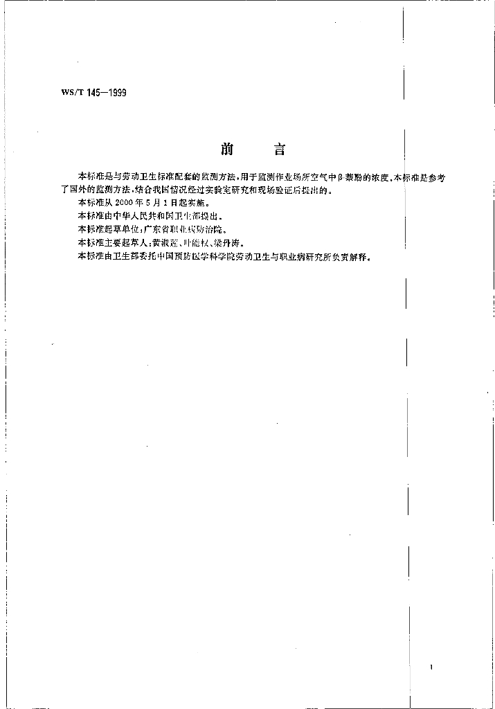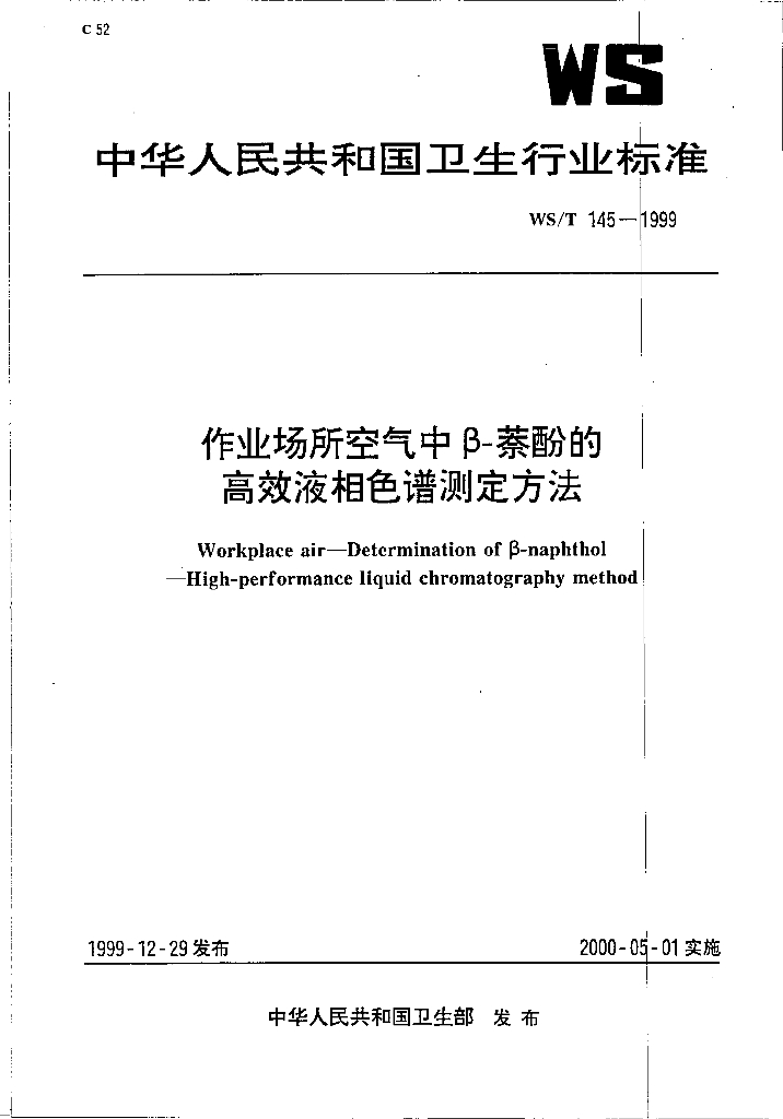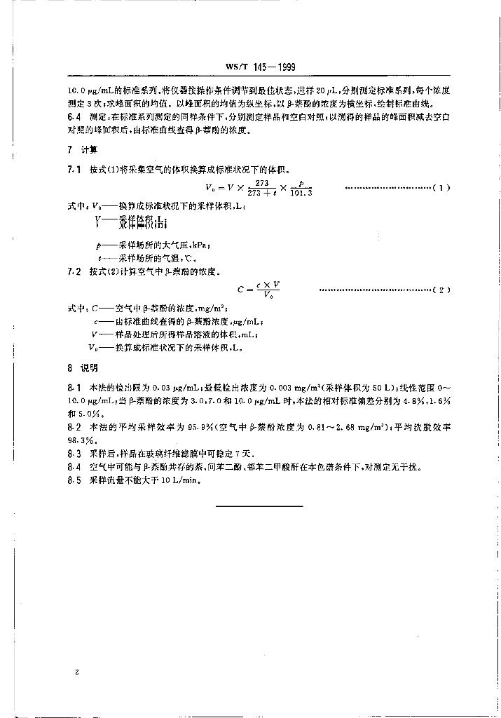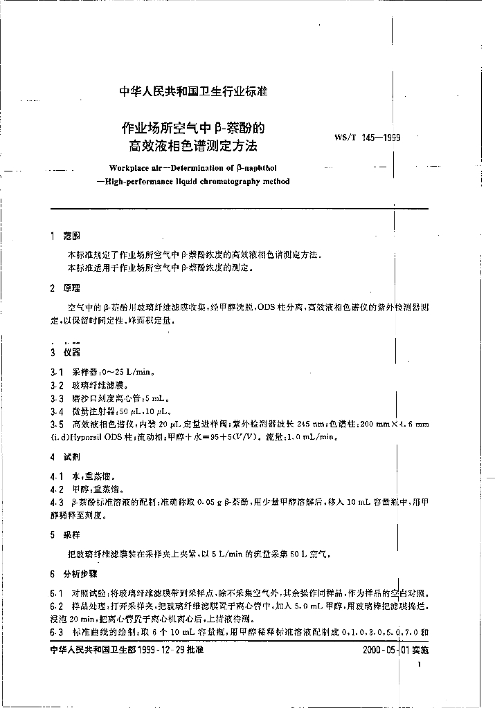 WS/T 145-1999 作业场所空气中β-萘酚的高效液相色谱测定方法