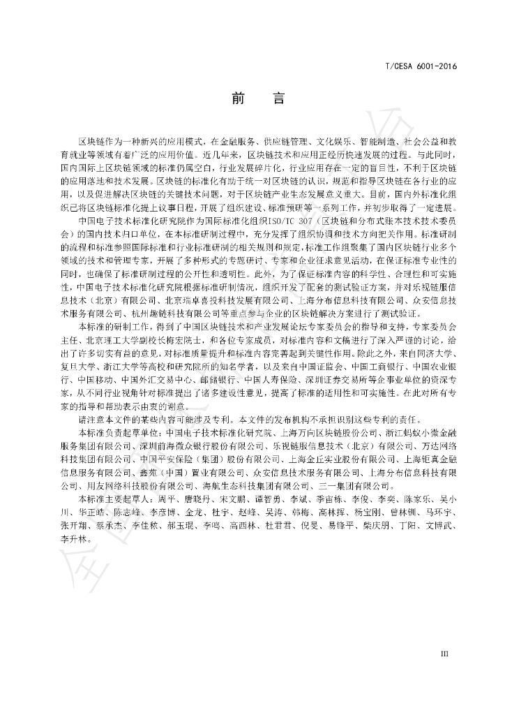 中国电子技术标准化研究院、上海万向区块链股份公司、浙江蚂蚁小微金融服务集团有限公司、深圳前海微众银行股份有限公司、乐视链服信息技术(北京)有限公司、万达网络科技集团有限公司、中国平安保险(集团)股份有限公司、上海金丘实业股份有限公司、上海钜真金融信息服务有限公司、鑫苑(中国)置业有限公司、众安信息技术服务有限公司、上海分布信息科技有限公司、用友网络科技股份有限公司、海航生态科技集团有限公司、三一集团有限公司