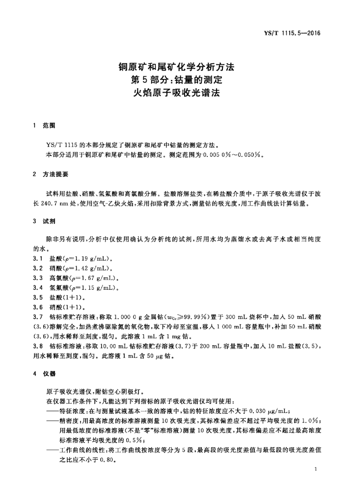 YS/T 1115.5-2016 铜原矿和尾矿化学分析方法 第5部分:钴量的测定 火焰原子吸收光谱法