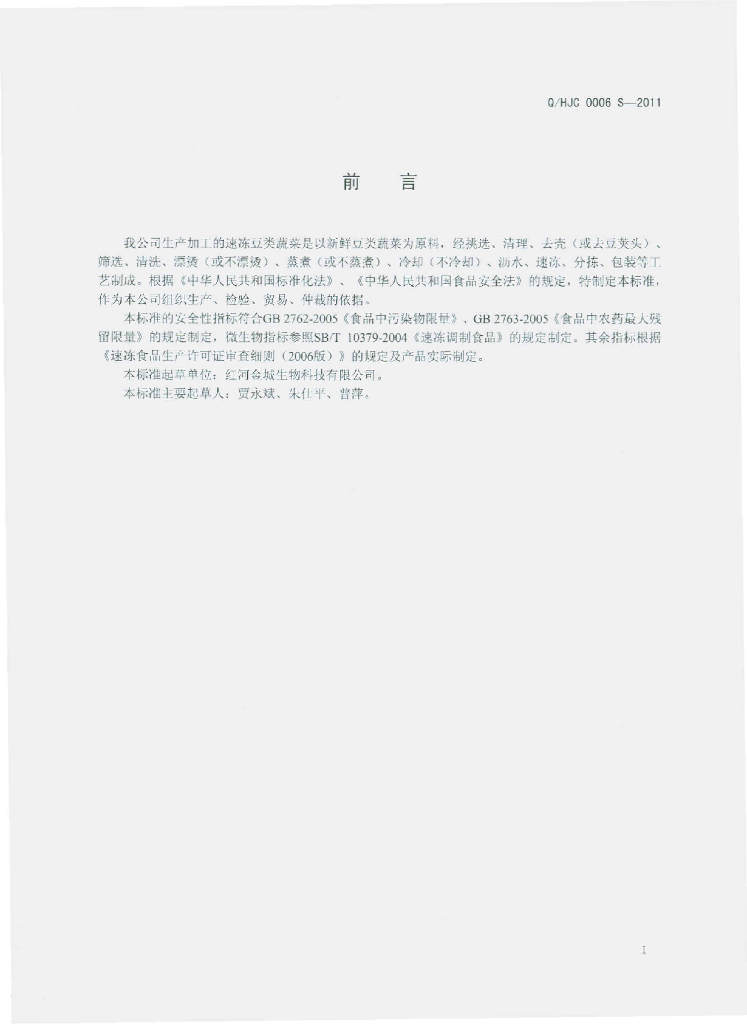 Q/HJC 0006S-2011 速冻豆类蔬菜