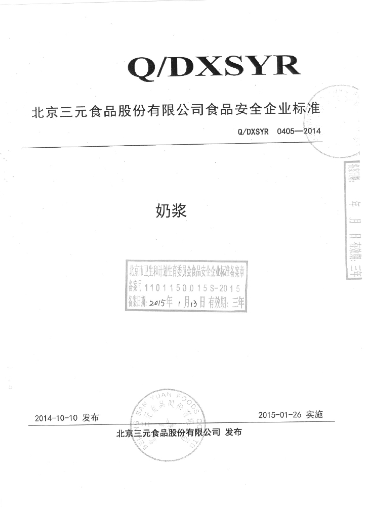 Q/DXSYR 0405-2014 北京三元食品控股有限公司 奶浆