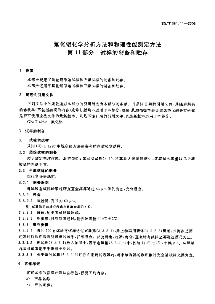 YS/T 581.11-2006 氟化铝化学分析方法和物理性能测定方法 第11部分:试样的制备和贮存