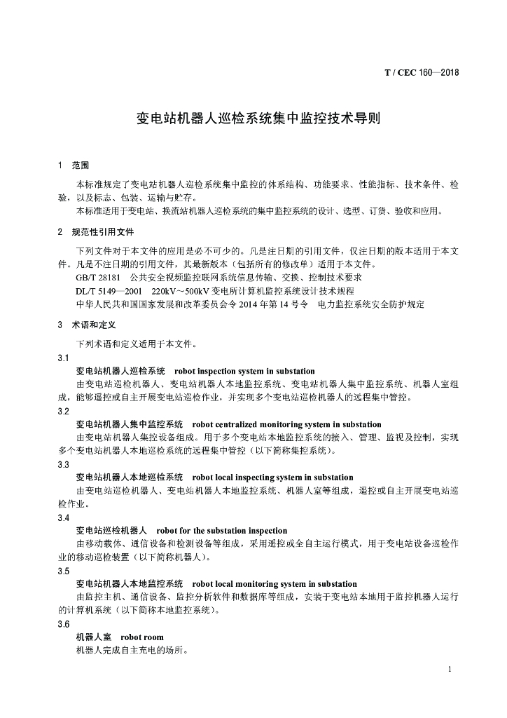 T/CEC 160-2018 变电站机器人巡检系统集中监控技术导则