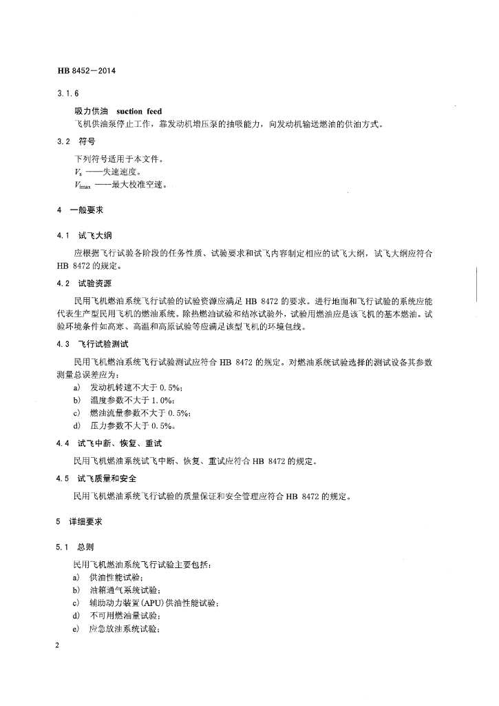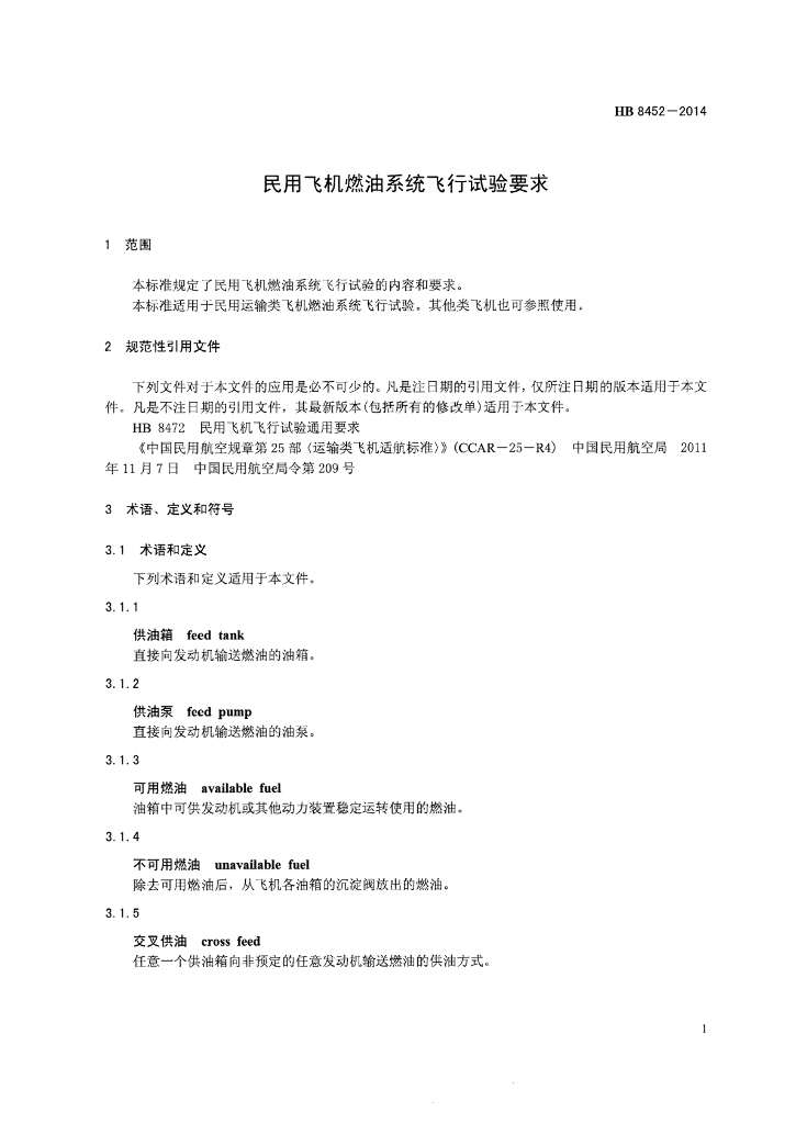 HB 8452-2014 民用飞机燃油系统飞行试验要求