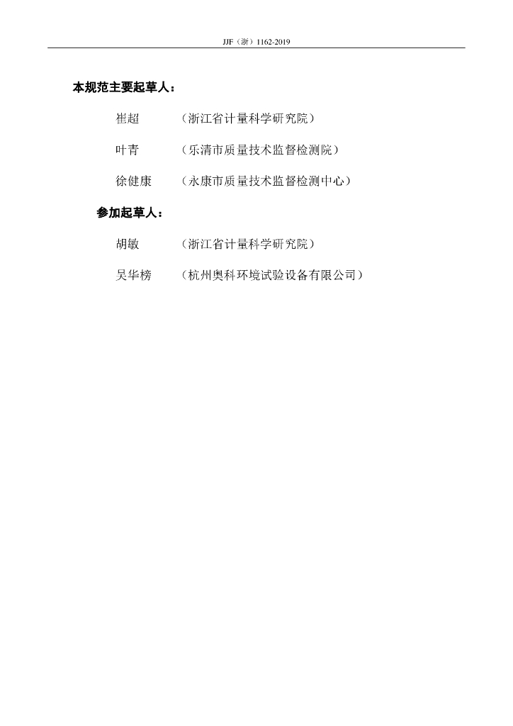 崔超(浙江省计量科学研究院)、叶青(乐清市质量技术监督检测院)、徐健康(永康市质量技术监督检测中心)、胡敏(浙江省计量科学研究院)、吴华榜(杭州奥科环境试验设备有限公司)