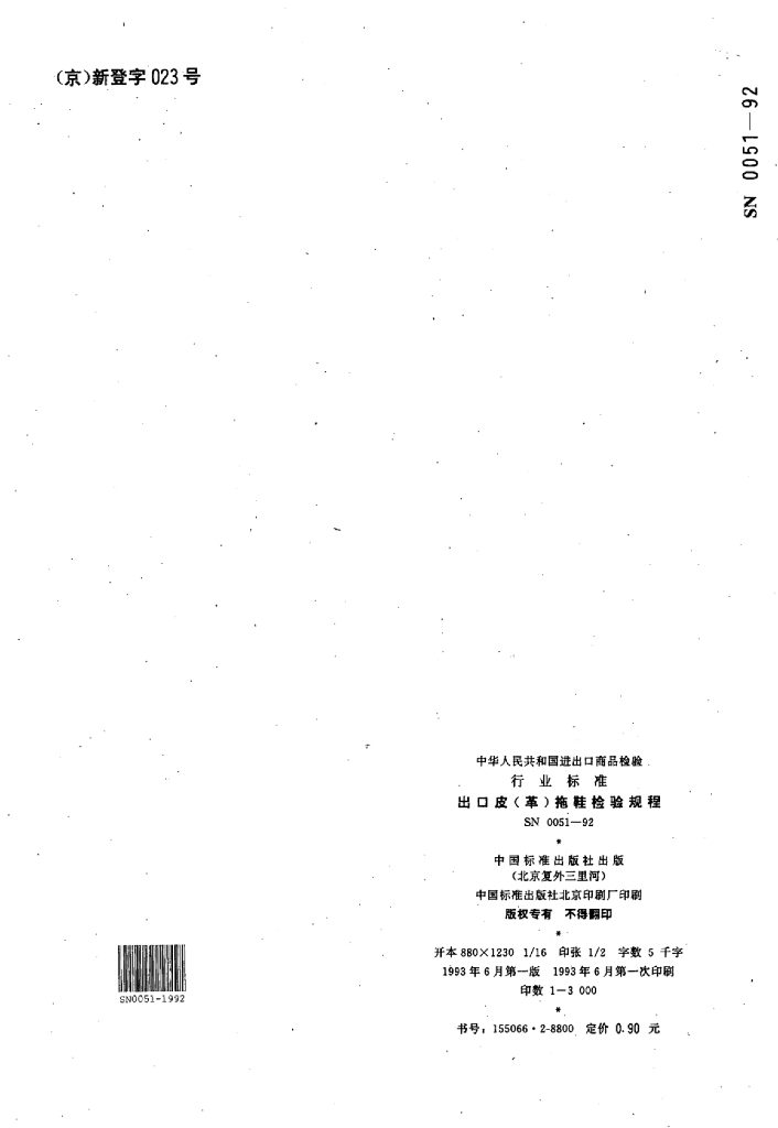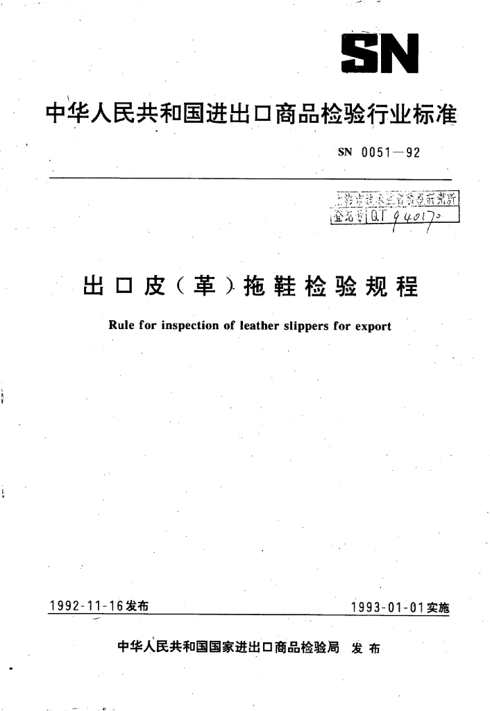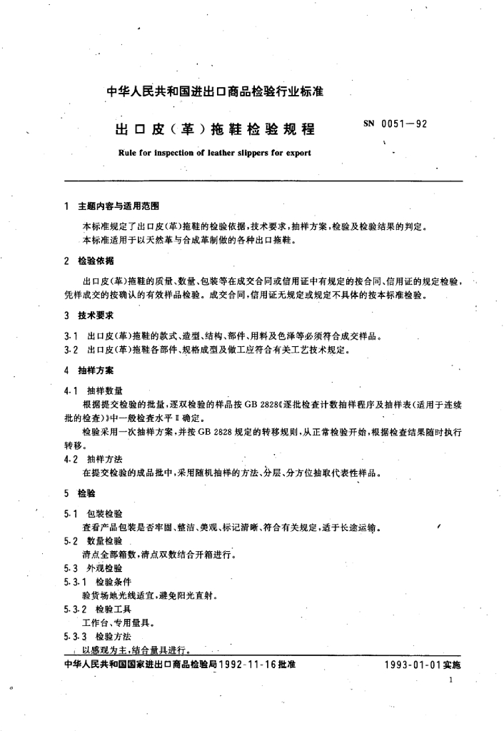 SN 0051-1992 出口皮(革)拖鞋检验规程