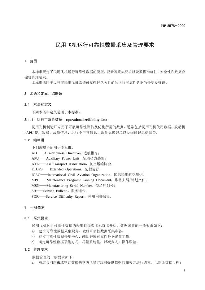 HB 8578-2020 民用飞机运行可靠性数据采集及管理要求