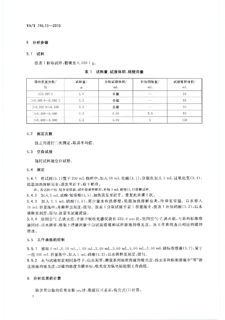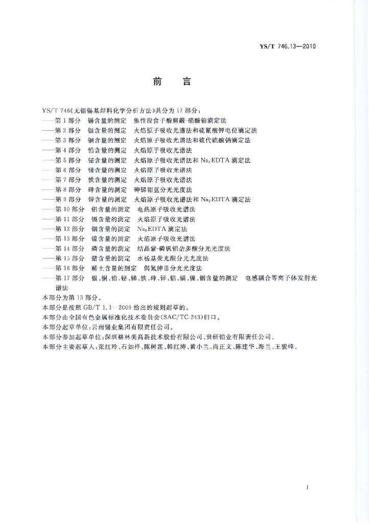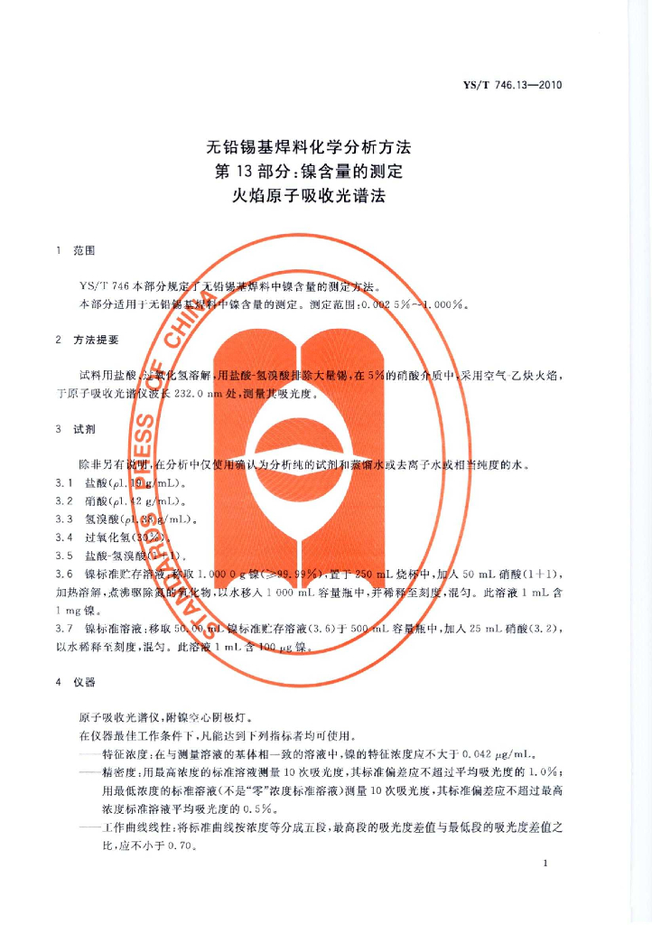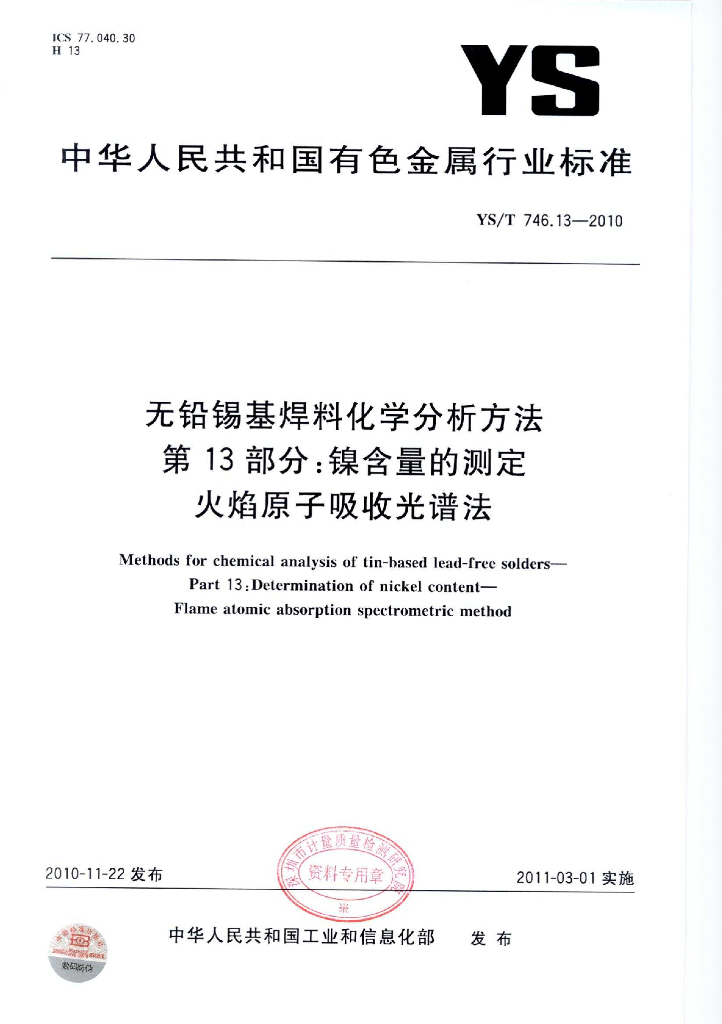YS/T 746.13-2010 无铅锡基焊料化学分析方法 第13部分:镍含量的测定 火焰原子吸收光谱法