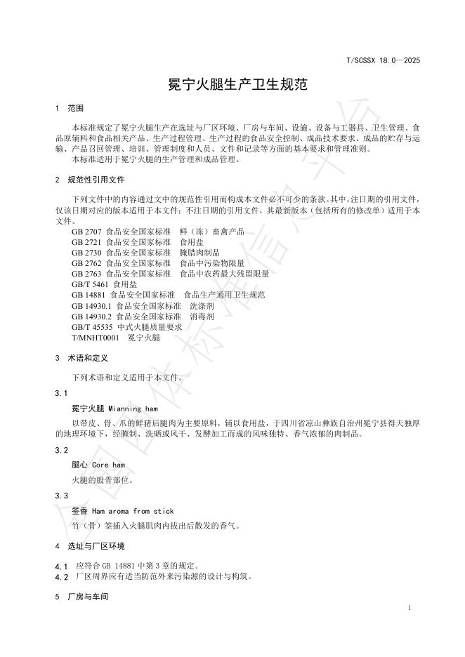 T/SCSSX 18.0-2025 冕宁火腿生产卫生规范