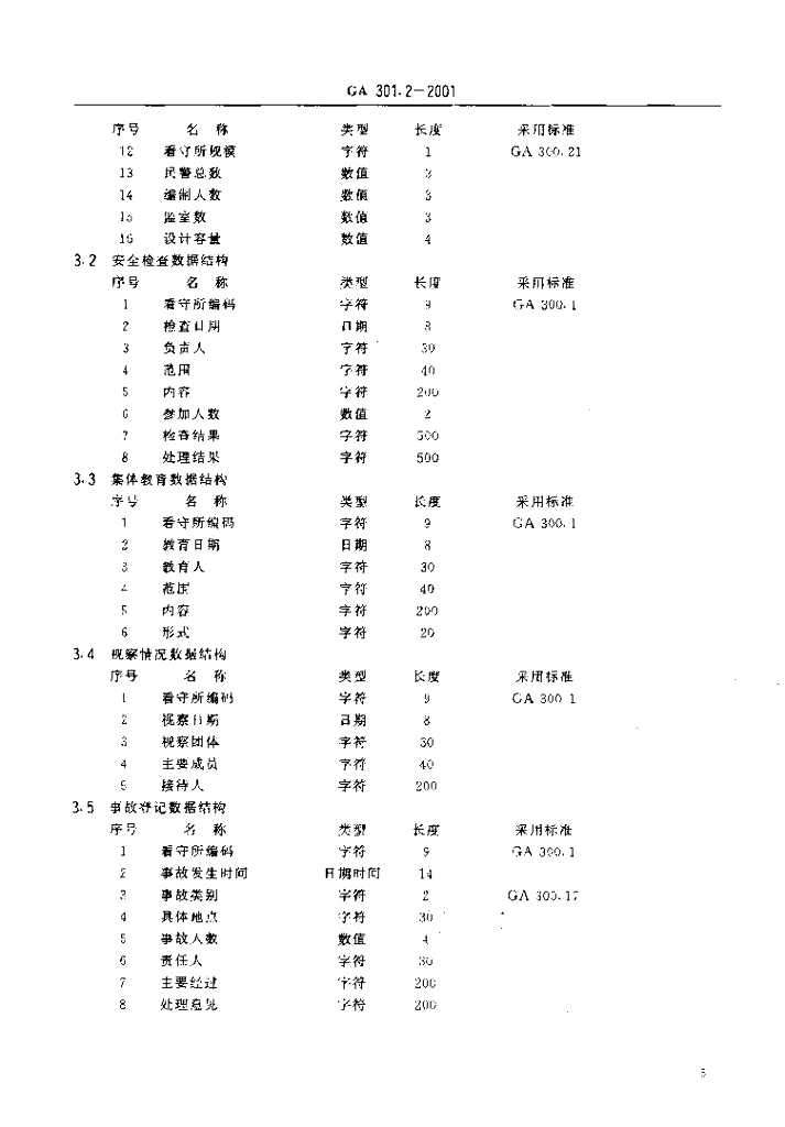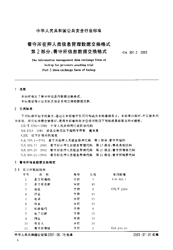 GA 301.2-2001 看守所在押人员信息管理数据交换格式 第2部分:看守所信息数据交换格式
