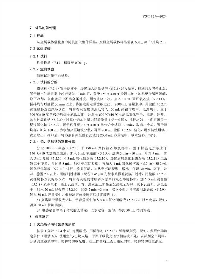YS/T 835-2024 尾气净化用金属载体催化剂中铂、钯和铑含量的测定 火焰原子吸收光谱法和电感耦合等离子体原子发射光谱法