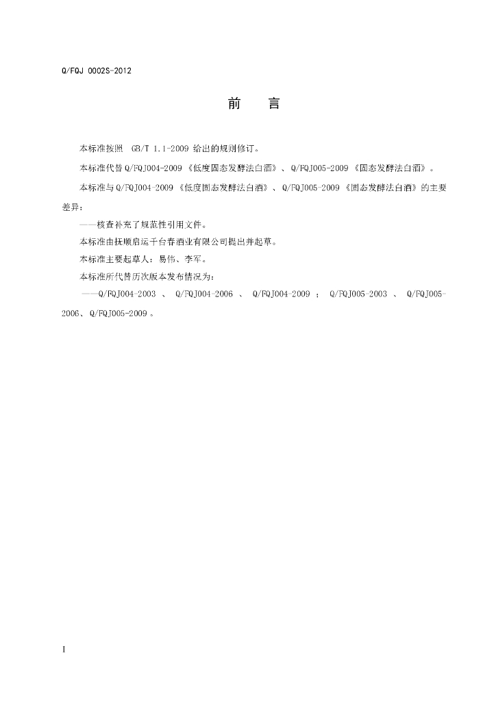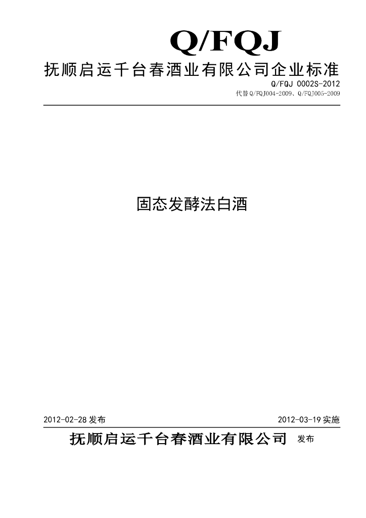 Q/FQJ 0002S-2012 固态发酵法白酒