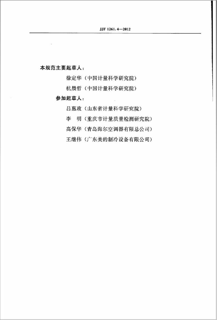 徐定华(中国计量科学研究院)、杭晨哲(中国计量科学研究院)、吕惠政(山东省计量科学研究院)、李明(重庆市计量质量检测研究院)、高保华(青岛海尔空调器有限总公司)、王继伟(广东美的制冷设备有限公司)