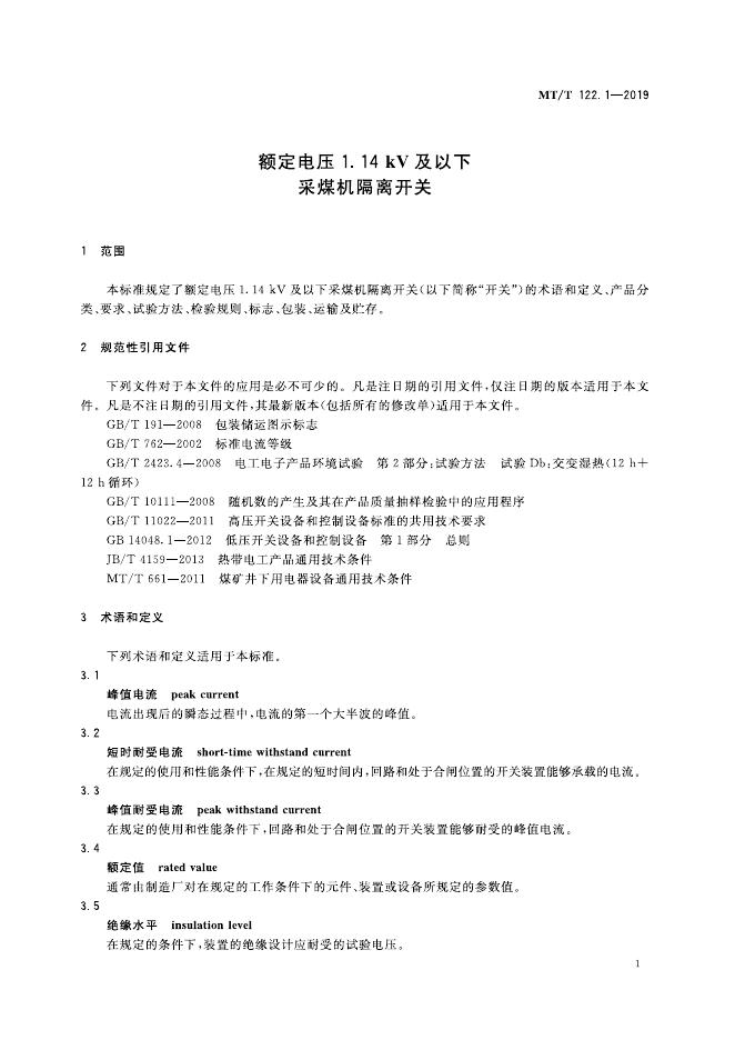 MT/T 122.1-2019 额定电压1.14kV及以下采煤机隔离开关