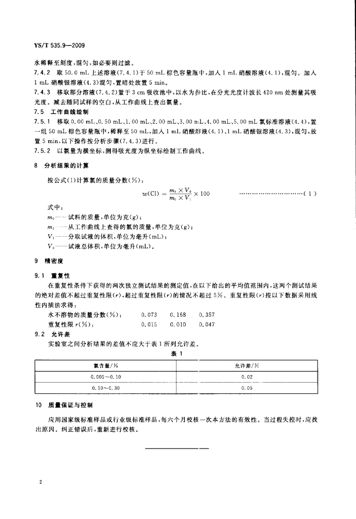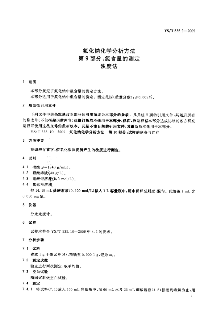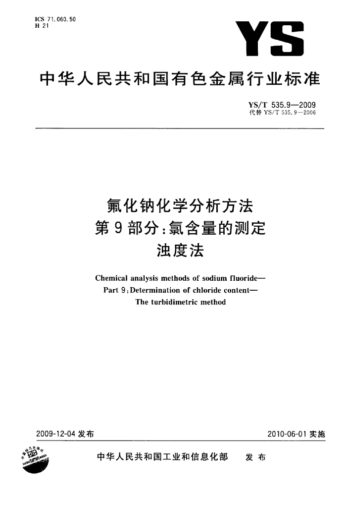 YS/T 535.9-2009 氟化钠化学分析方法 第9部分:氯含量的测定浊度法