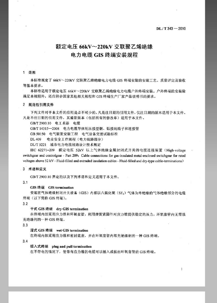DL/T 343-2010 额定电压66kV~220kV交联聚乙烯绝缘电力电缆GIS终端安装规程