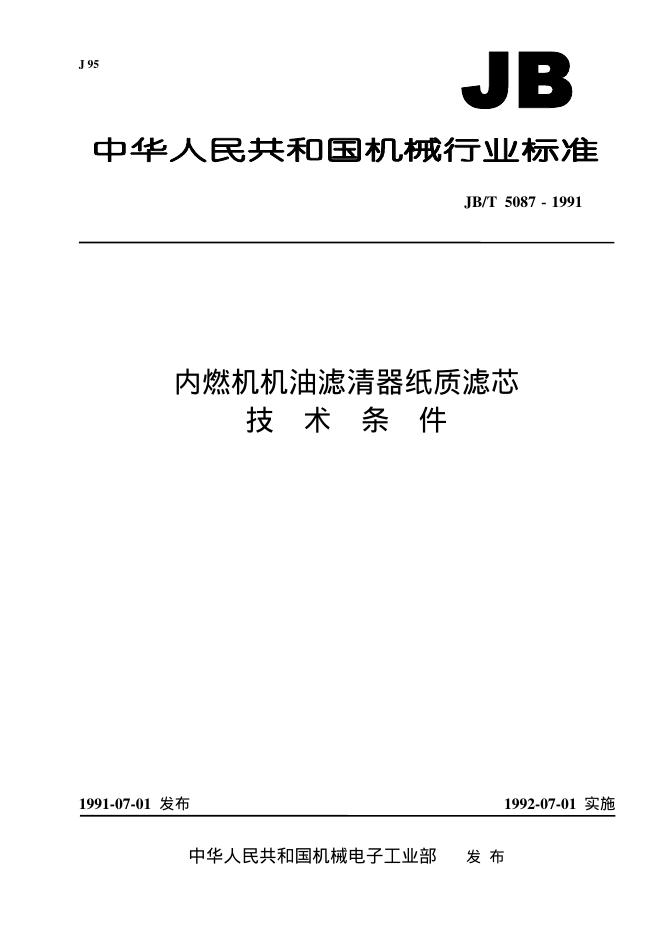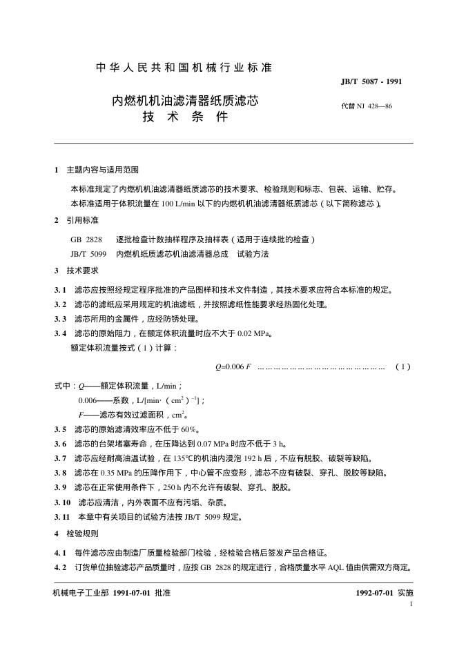 JB/T 5087-1991 内燃机机油滤清器纸质滤芯 技术条件
