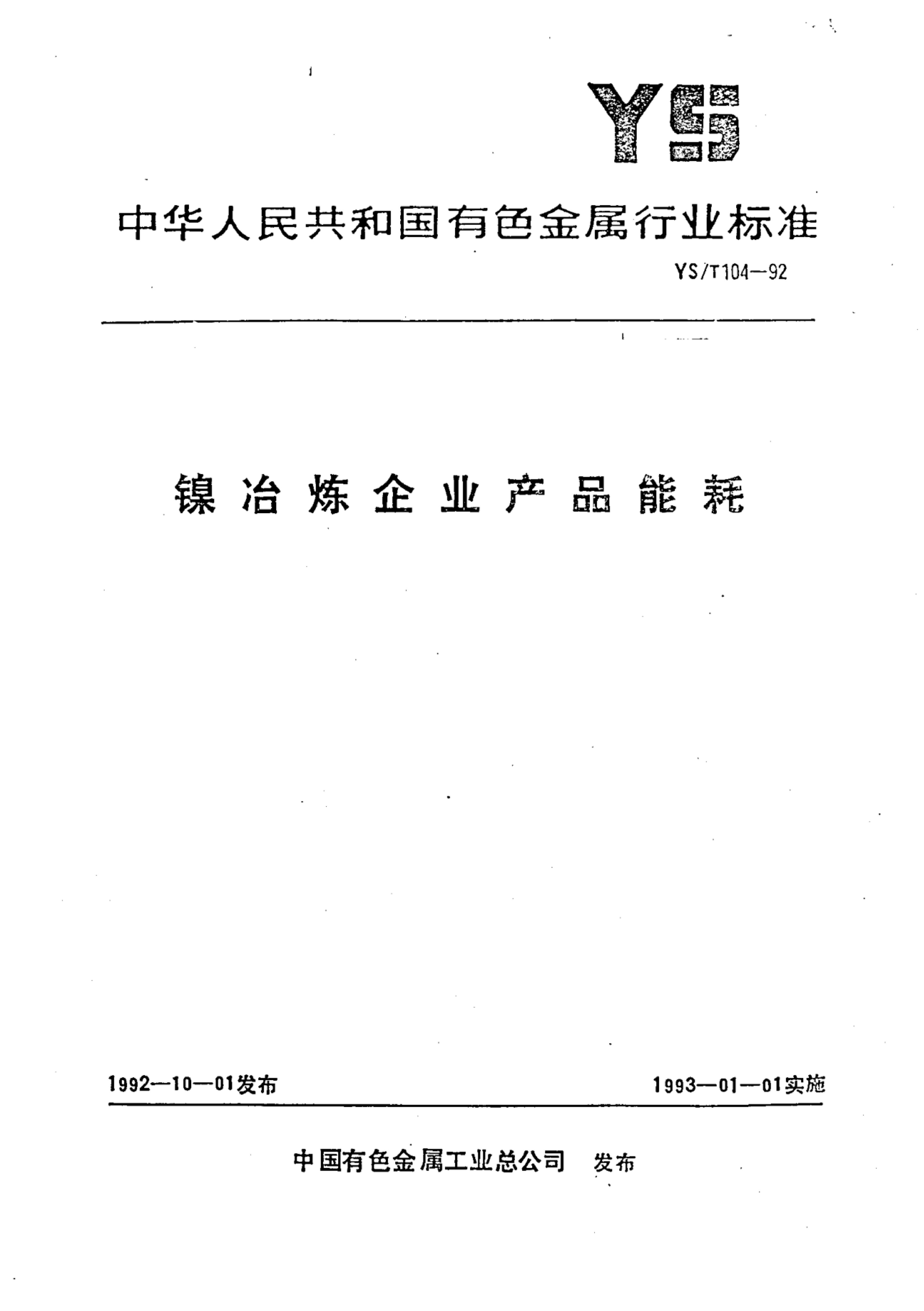 YS/T 104-1992 镍冶炼企业产品能耗