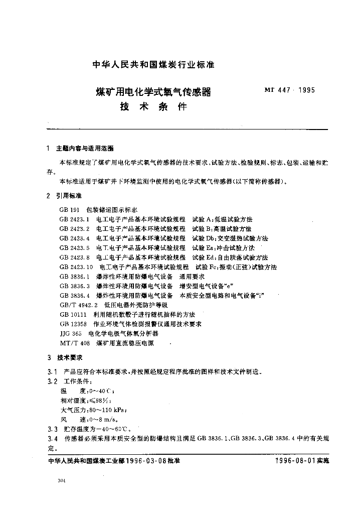 MT 447-1995 煤矿用电化学式氧气传感器技术条件