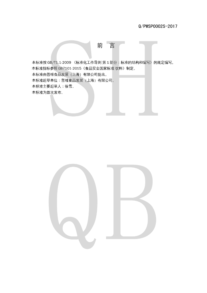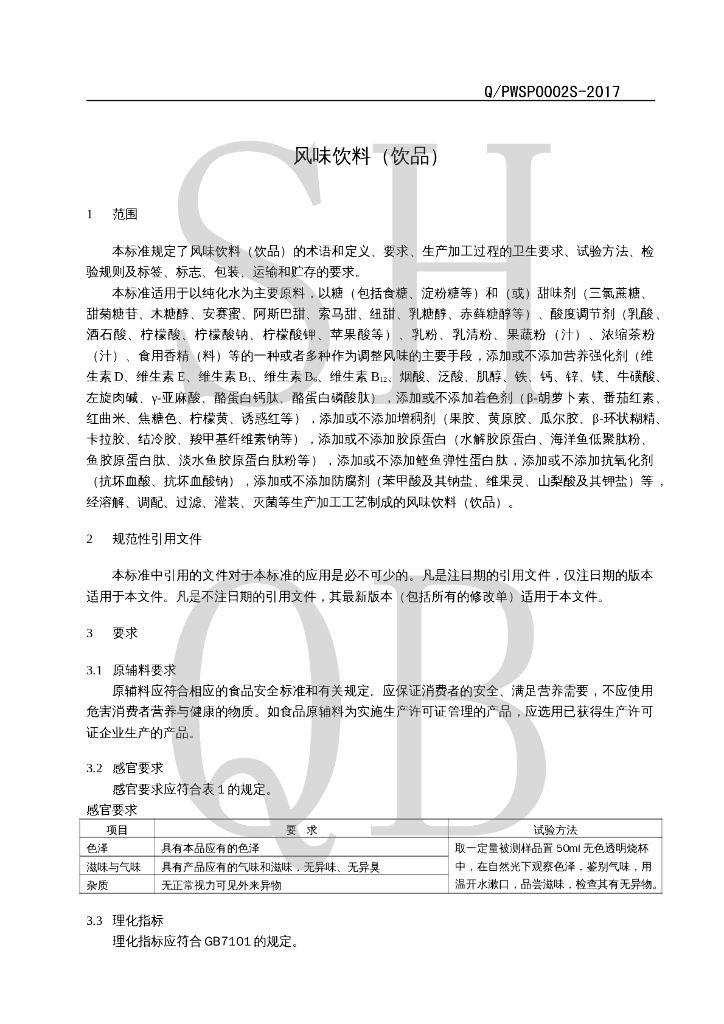 Q/PWSP 0002S-2017 风味饮料(饮品)