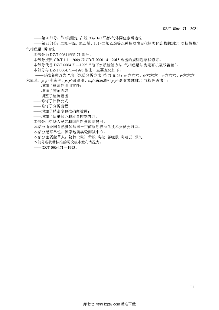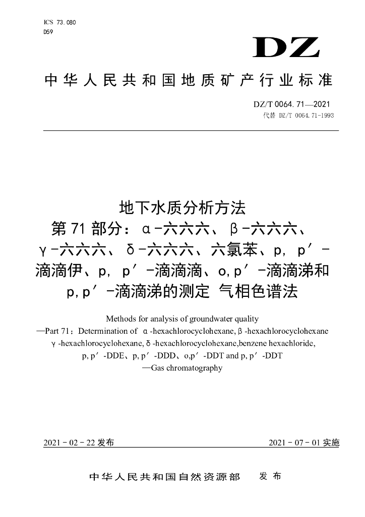 DZ/T 0064.71-2021 地下水质分析方法 第71部分:α – 六六六、β – 六六六、γ – 六六六、δ – 六六六、六氯苯、p,p’ – 滴滴伊、p,p’ – 滴滴滴、o,p’ – 滴滴涕和 p,p’ – 滴滴涕的测定 气相色谱法