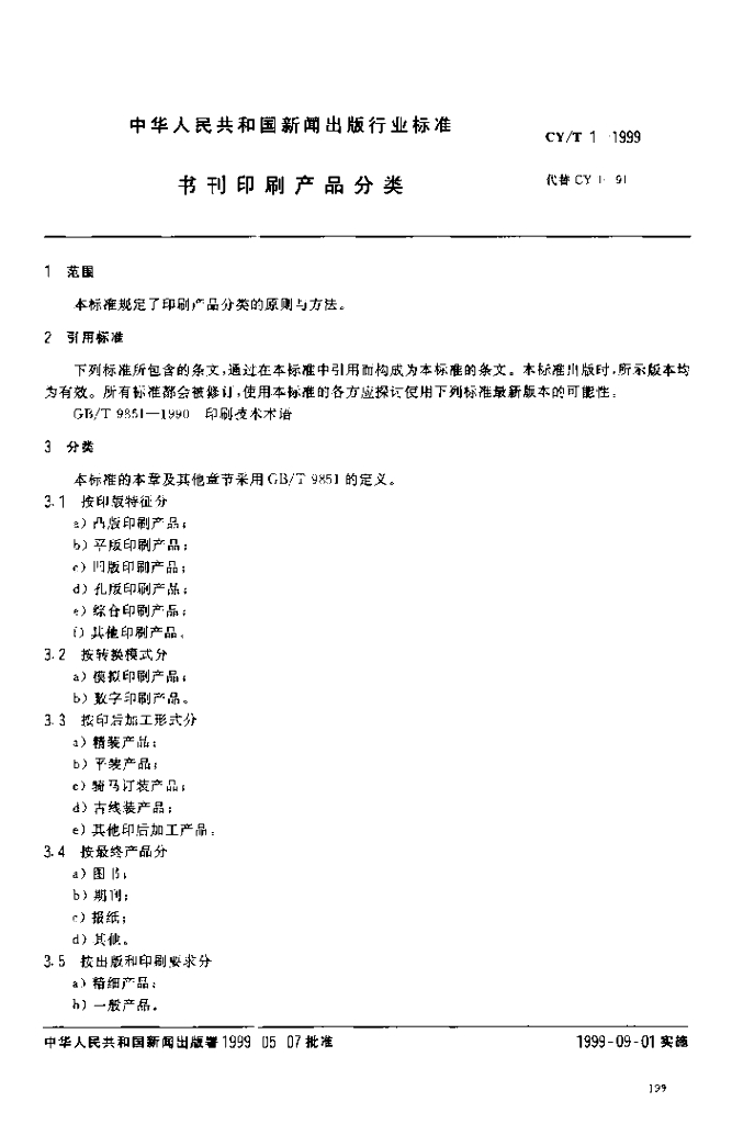 CY/T 1-1999 书刊印刷产品分类
