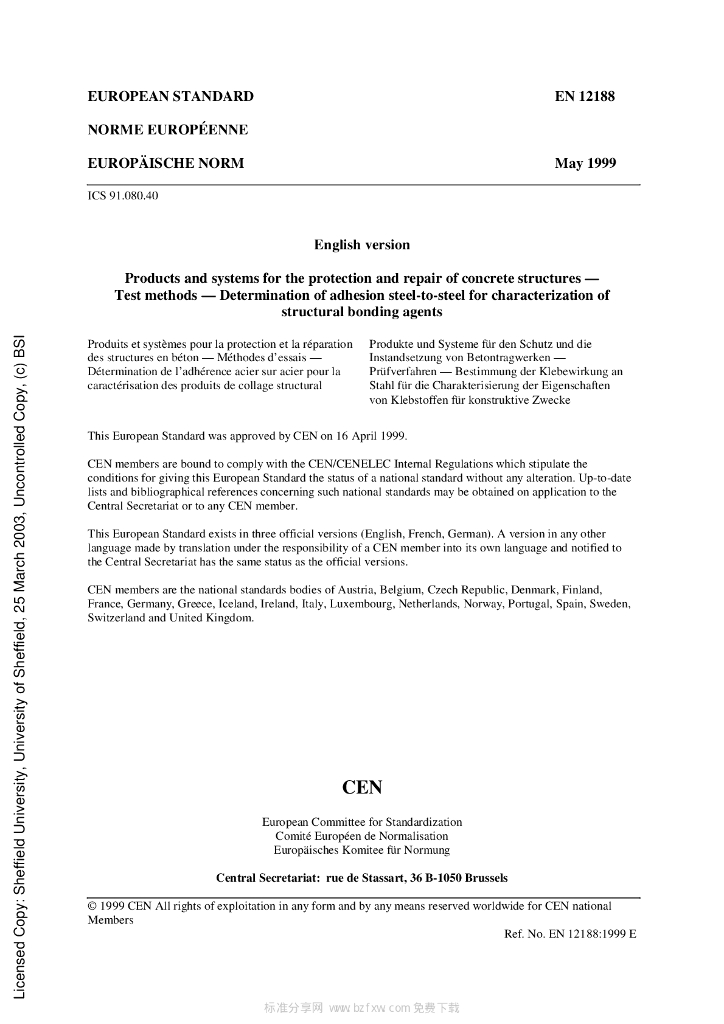 BS EN 12188-1999 混凝土结构的防护和修整用的产品和系统 试验方法 结构胶粘剂表征用钢与钢胶粘作用的测定
