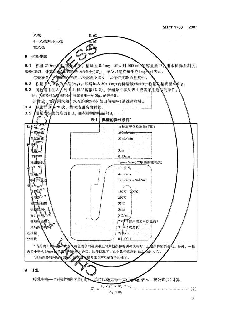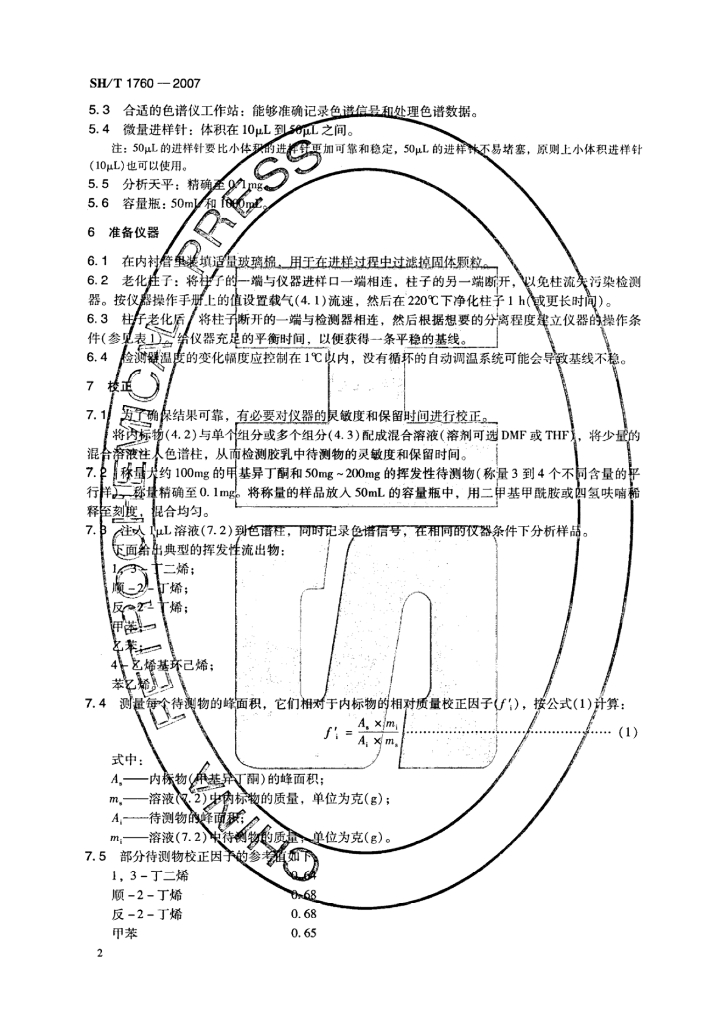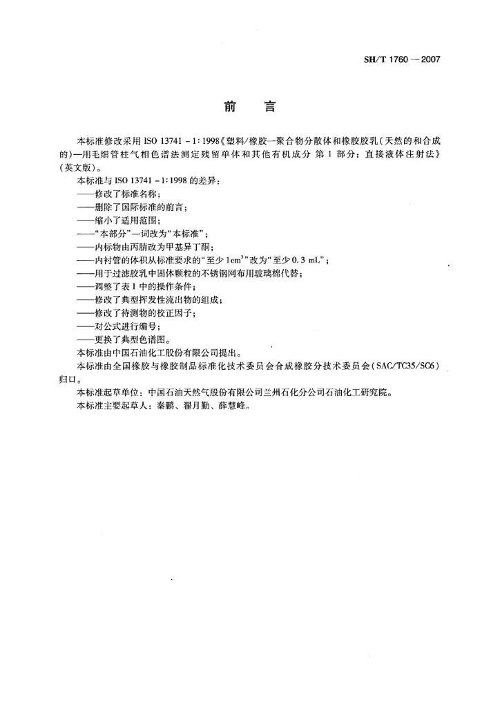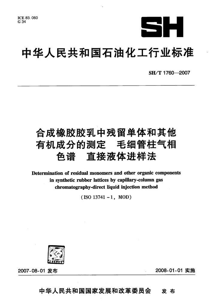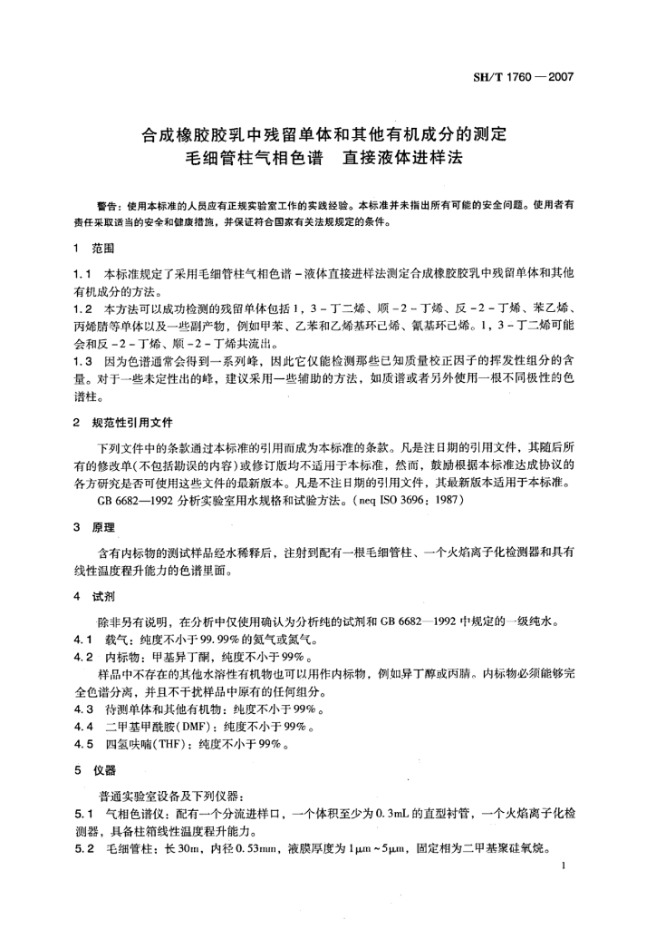 SH/T 1760-2007 合成橡胶胶乳中残留单体和其他有机成分的测定 毛细管柱气相色谱 直接液体进样法