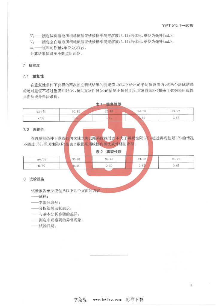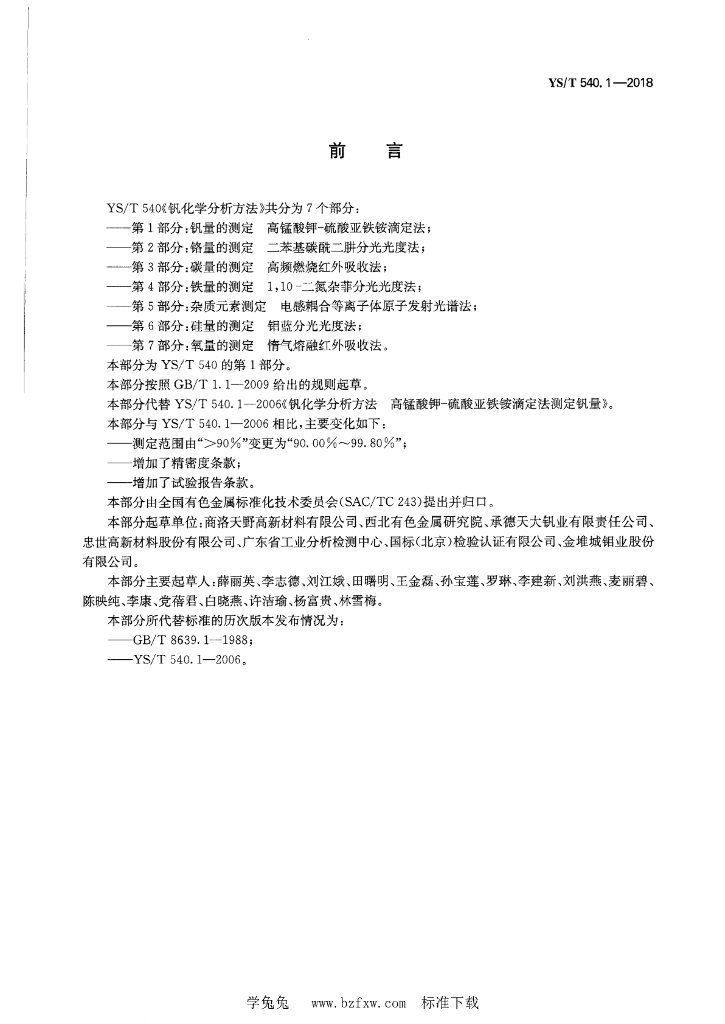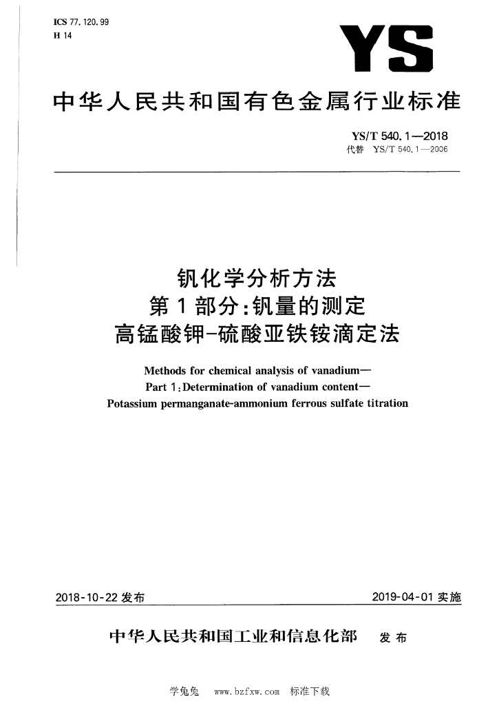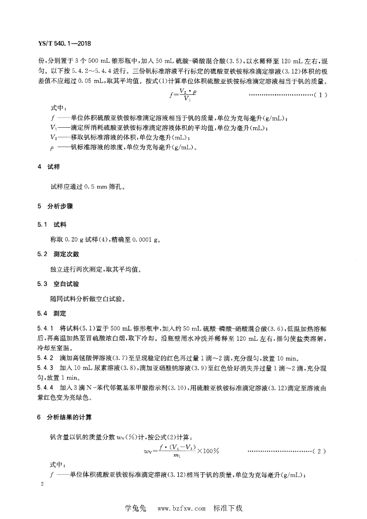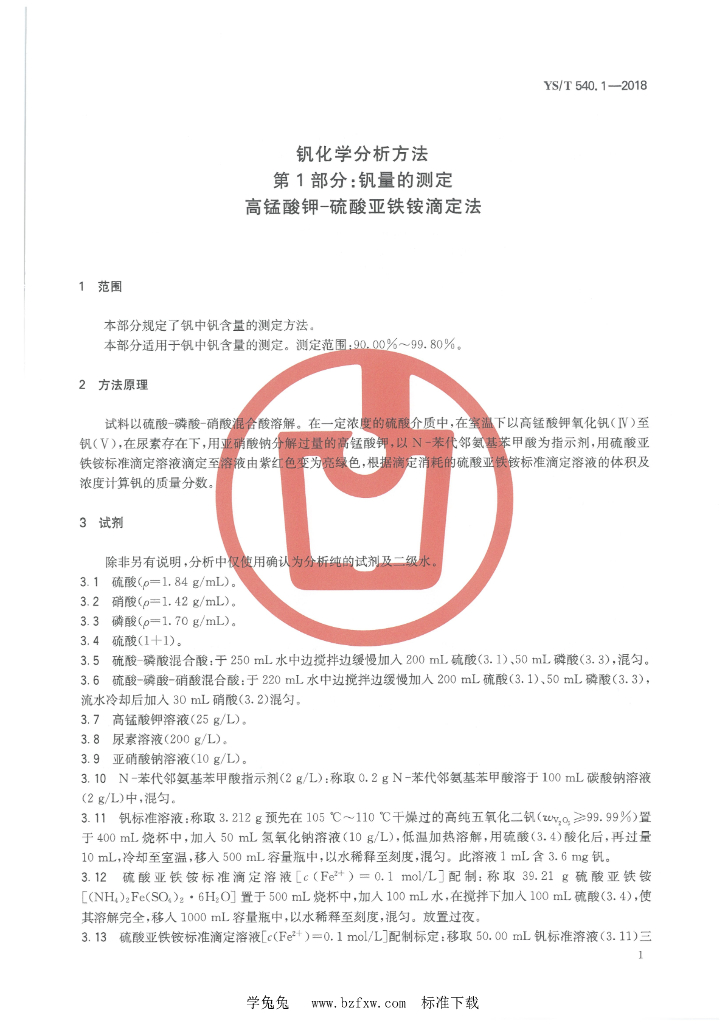 YS/T 540.1-2018 钒化学分析方法 第1部分:钒量的测定 高锰酸钾-硫酸亚铁铵滴定法